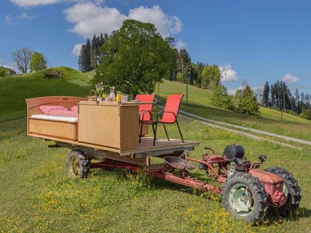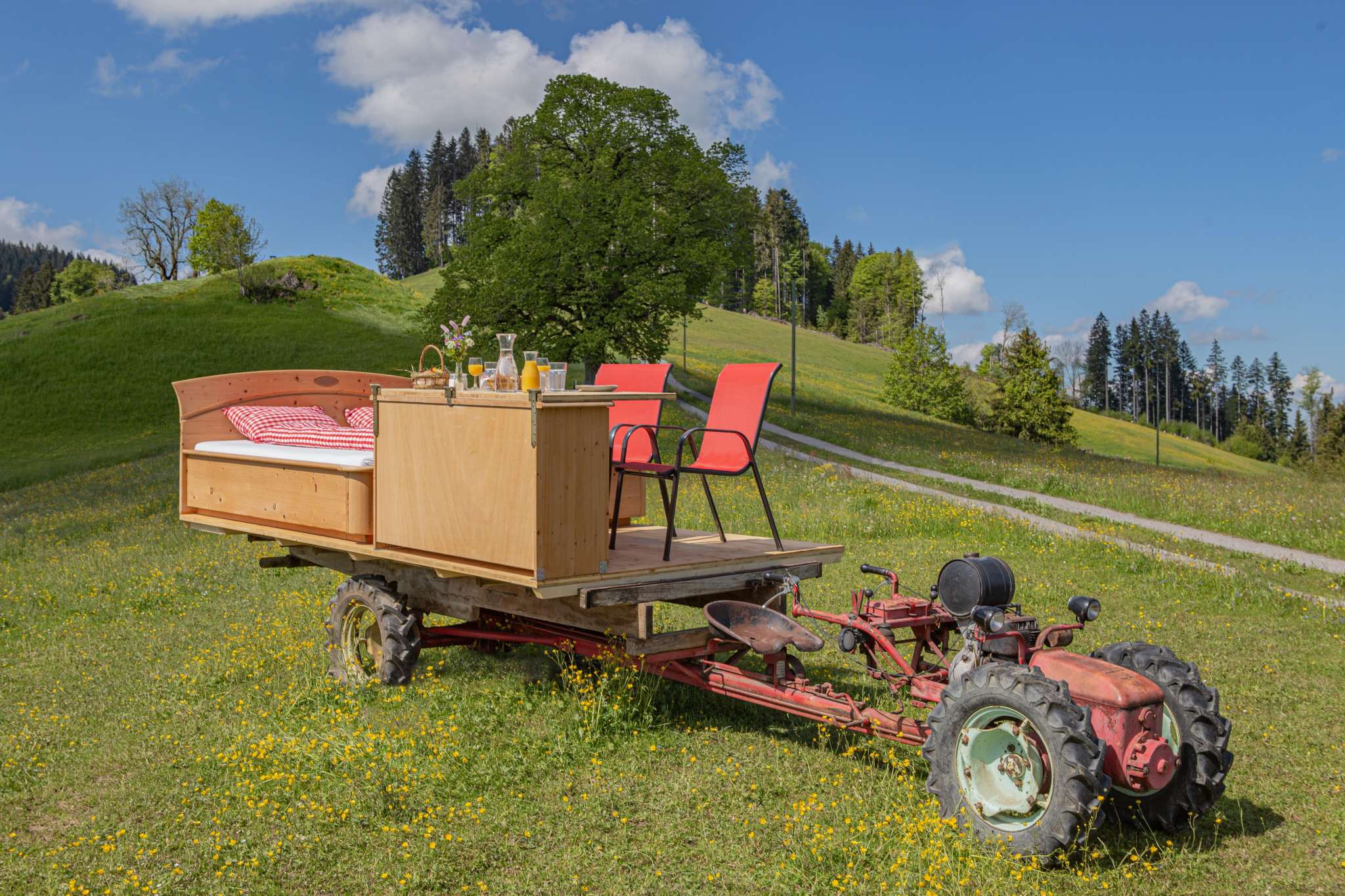 Wir haben dem Aebi (Einachser) unseres Urgrossvaters eine neue Aufgabe gegeben. In den letzten Monaten haben wir auf seine Ladebrücke ein Doppelbett, Stühle und eine Kommode gebaut. So können wir Dein Hotelzimmer an den von Dir gewünschten Ort fahren. Das grosse Doppelbett und die kuschlige Decke sorgen für den nötigen Komfort, falls Du zwischen dem Bestaunen des Nachthimmels und des Alpen-Panoramas trotzdem noch ein Auge zutun möchtest. Am Morgen servieren wir Dir/Euch gerne ein leckeres Frühstück (mit hofgemachten Zutaten) ans Bett.