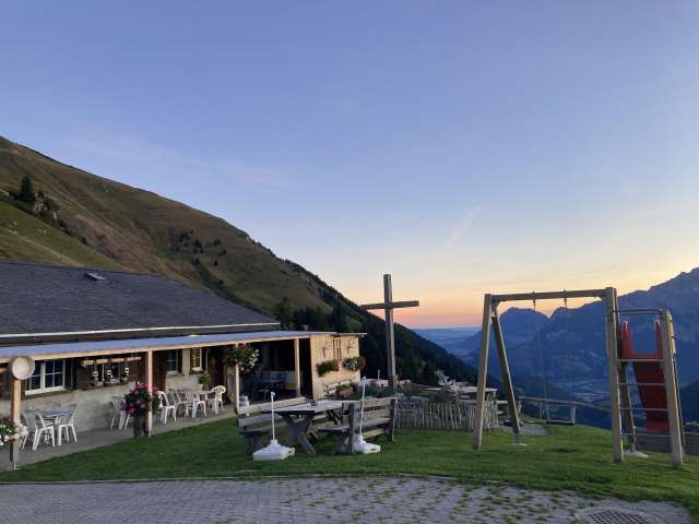 Nach der kurzen Bahnfahrt und einer bequemen halbstündigen Wanderung geniessen Sie eine Älplerkässchnitte oder ein feines z`Vieriplättli mit regionalen sowie auf der Alp produzierten Köstlichkeiten. Für die kleinen Gäste steht ein Kinderspielplatz gleich neben der Gartenbeiz.