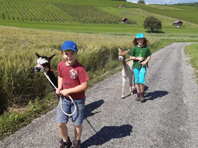 Geniessen Sie auf einem Spaziergang mit unseren Alpakas eine unbeschwerte Auszeit oder einfach einen gemütlichen Nachmittag mit Ihrer Familie.