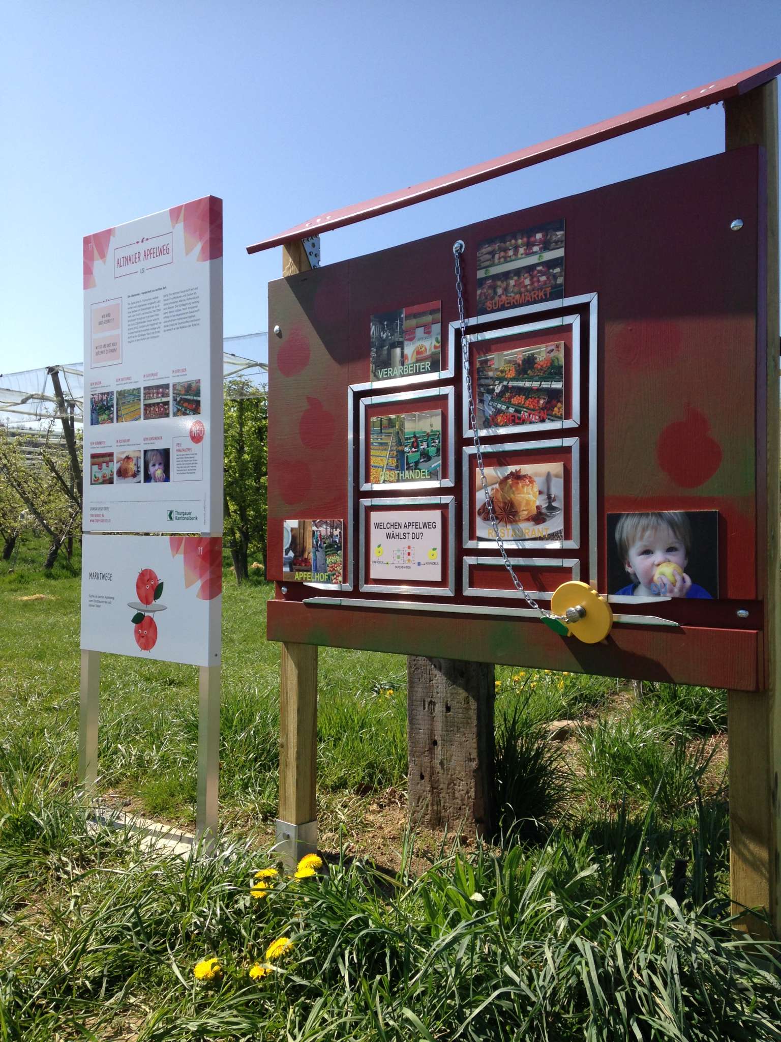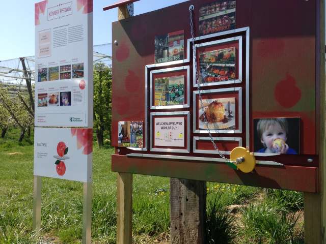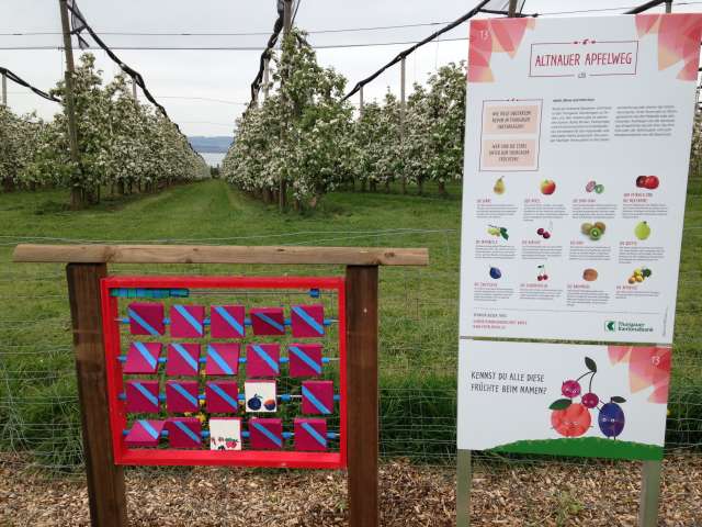 Leicht erhöht und direkt am Bodensee gelegen hat Altnau mehr Apfelbäume als Einwohner – und einen herrlichen Blick auf den Bodensee. Der Apfelweg zeigt, wie wichtig der Obstanbau seit Generationen für die Kultur des Ortes ist. Neu gestaltete Info-Tafeln mit Apfelsorten-Rätseln, Witzen und Fragen vermitteln Wissenswertes rund um das Apfelanbaugebiet und die rotbackige Frucht. Die drei Apfelmaskottchen Fredi, Lisi und Emma sprechen Kinder von den Schildern auf Augenhöhe an und präsentieren lustige Mitmach-Angebote.