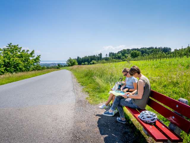 Oberhalb von Roggwil bei Watt befindet sich der Aussichtspunkt Rüti. Von hier aus haben Velofahrer und Spaziergänger einen fantastischen Ausblick auf die umliegende Region und den Bodensee. Und ein Bänkli lädt für eine gemütliche Verschnaufpause ein.