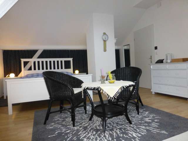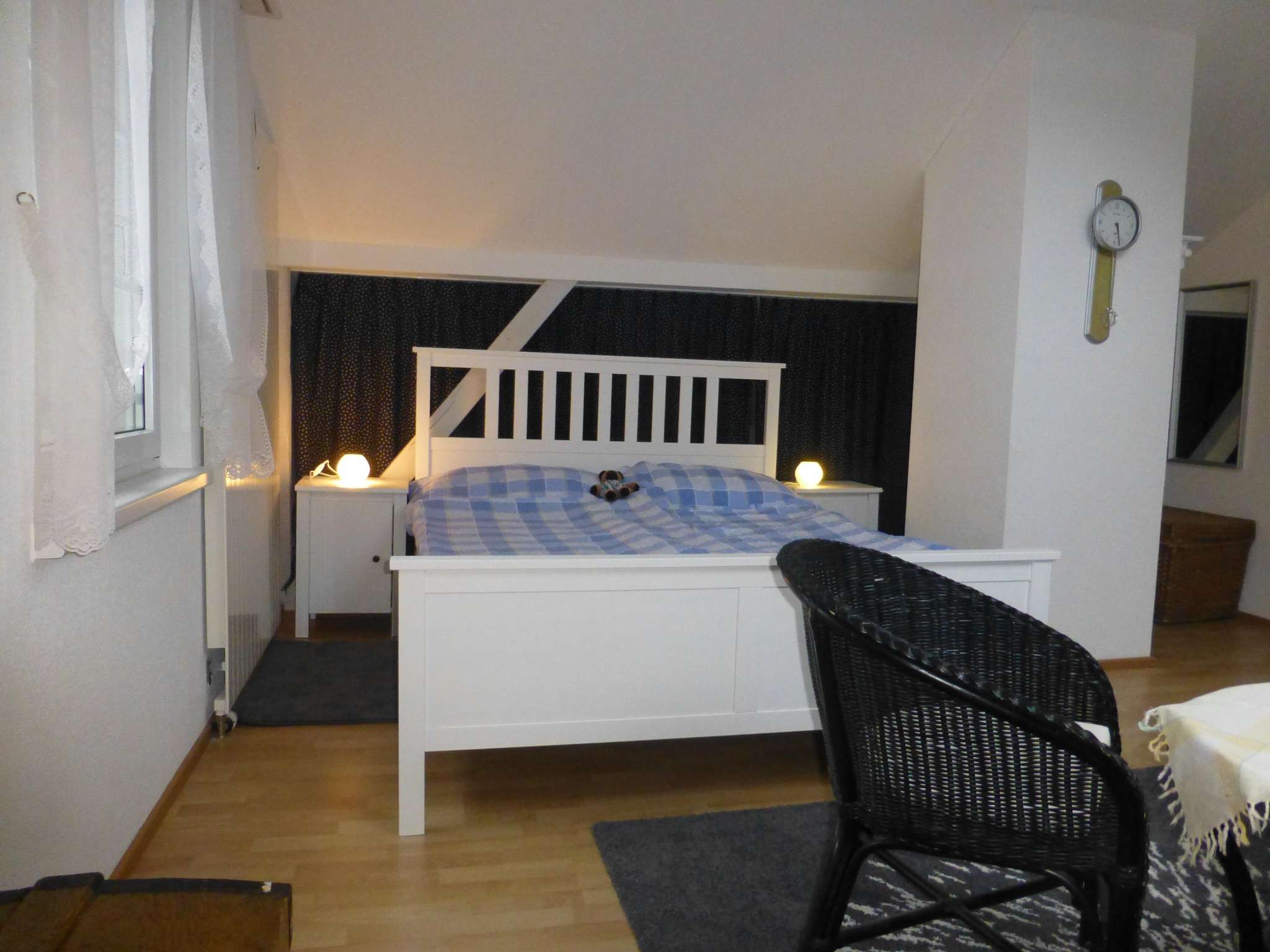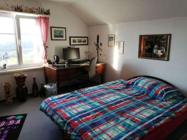 Ein helles, grosses und frisch renoviertes Dachzimmer (22 m2) für 2-3 Personen mit TV, Radio, W-Lan, Wasserkocher, einem Doppelbett sowie einer Schlafcouch. Angrenzend steht den Gästen ein neu erstelltes modernes Badezimmer zur alleinigen Benutzung zur Verfügung.