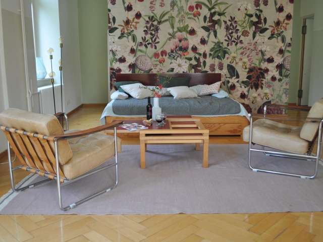 In der Villa mit Geschichte, umgeben vom wildromantischen Garten erwarten die Gäste grosszügige Räume und ein lauschiger Gartensitzplatz um sich zu erholen und ihre Ferien zu geniessen. Darüber hinaus gibt es einen separaten Arbeitsplatz mit WLAN und die Möglichkeit im Wohnbereich ein zweites Bett zu nutzen.