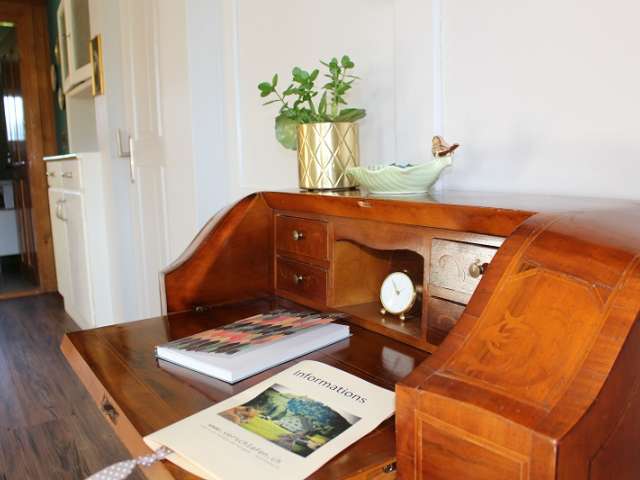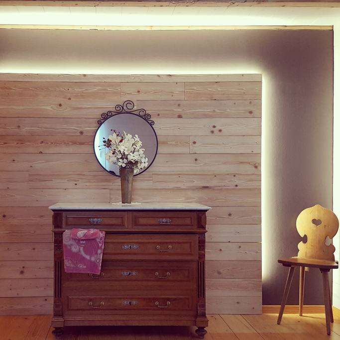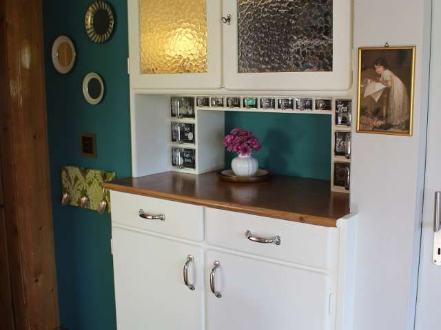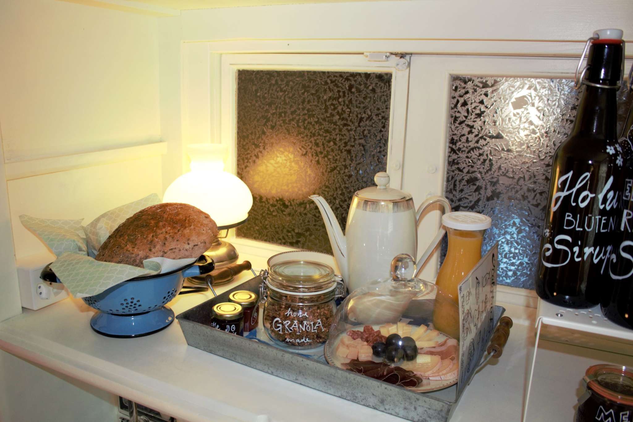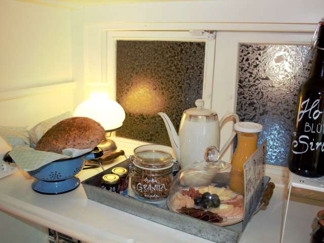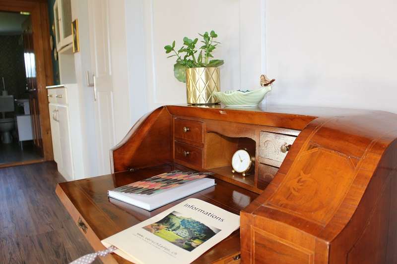 Wir haben die Wohnung mit einem restaurierten Küchenmöbel von unserem Wohnbereich abgetrennt. Das gute Möbelstück haben wir umfunktioniert, damit man durch das Kästli kommunizieren kann (beide Seiten können öffnen) und wir euch über die Durchreiche das Frühstück (auf Bestellung) bereitstellen können. Es ist uns wichtig, dass ihr als Gäste die uneingeschränkte Privatsphäre habt und trotzdem ganz unkompliziert mit uns in Kontakt treten könnt.