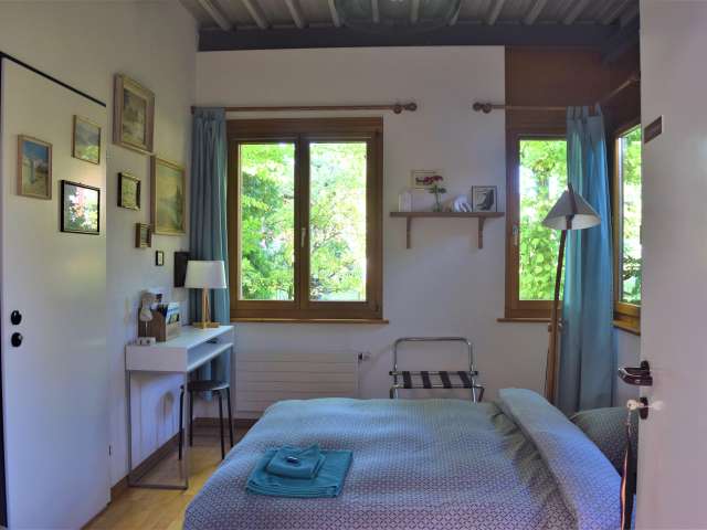Im Herzen des Thurgaus, am Fusse des Ottenbergs, liegt Weinfelden. Wie der Name schon sagt, wird hier Wein produziert – sehr guter noch dazu. Das Städtchen mit seinen vielen Riegelhäusern ist klein und süss und guter Ausgangspunkt in alle Richtungen des Thurgaus. Das Bed & Breakfast «Rosenstrasse» bietet zwei liebevoll eingerichtete Zimmer an ruhiger, zentraler Lage mit separatem Eingang, wo ein kleines Biotop mit Sitzplatz grüsst. Die Wohnung verfügt über eine kleine Küchenzeile ohne Herd. Toilette und Dusche werden gemeinschaftlich genutzt. Ins Dorfzentrum oder an den Bahnhof sind es nur 5 Minuten zu Fuss. Ab hier startet auch der Weinfelder Weinweg, der den Weinbau und die edlen Tropfen der Region aus einem Weinsafe erlebbar macht. In 40 Minuten ist der Flughafen Zürich mit dem Zug erreichbar. An den Bodensee oder ins Deutsche Konstanz geht’s in 20 Minuten ab Weinfelden.