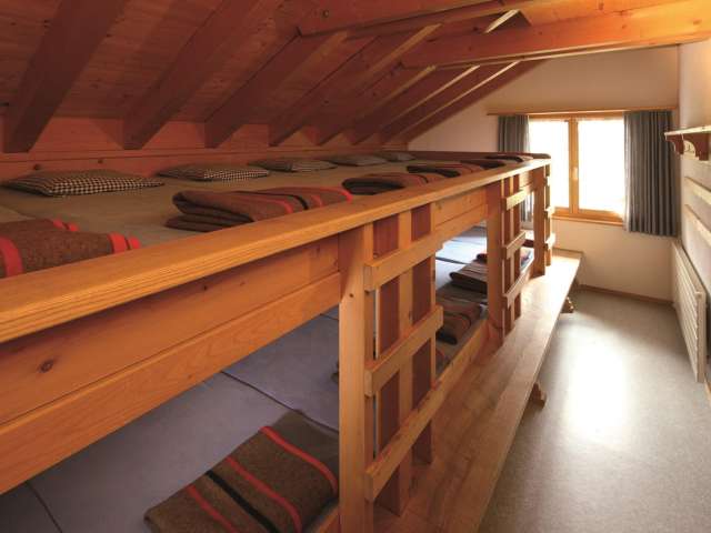Massenlager mit einem 9er-Schlafsaal und zwei 13er-Schlafsäle, verfügbar vom 1. Oktober bis 30. April geeignet für Gruppen. Küche und Aufenthaltsraum vorhanden, Halbpension im Restaurant möglich.
