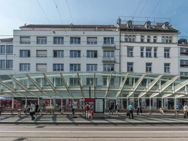 Die Bushaltestelle am Marktplatz ist ein Bauwerk des Architekten Santiago Calatrava - unverkennbar mit dem weissen Gerüst und den Glasschirmen.