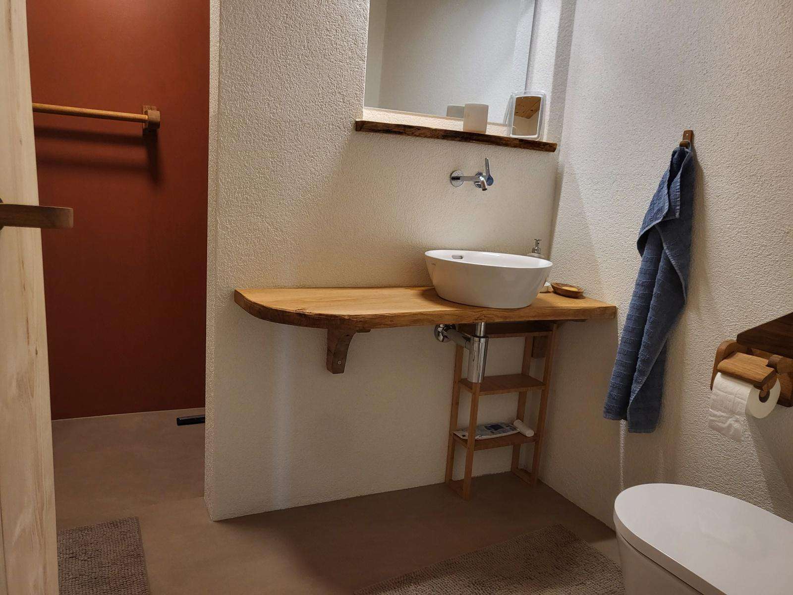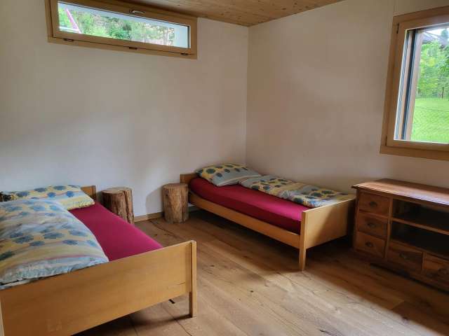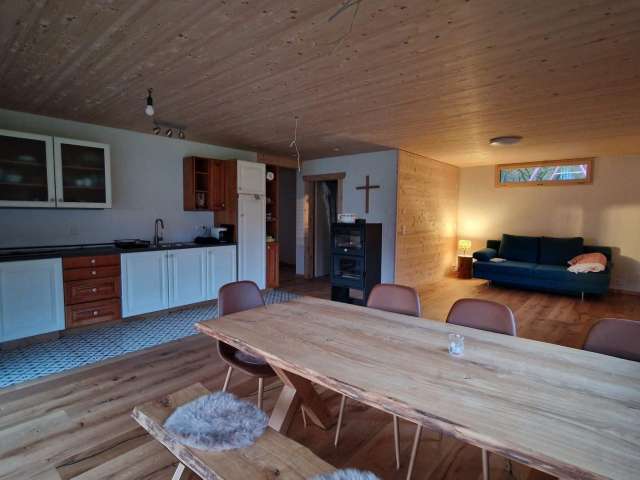 Die Ferienwohnung bietet Platz für bis zu sechs Personen, einen offenen Wohn‑ und Essbereich mit Holzofen, eine zweckmässige Küche sowie Bad mit Dusche und Waschmaschine. WLAN und Parkplatz sind inklusive.