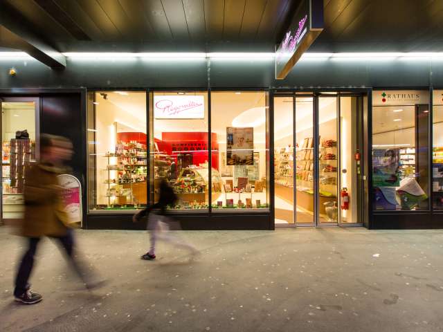 Zum genussvollen Angebot gehören die berühmten St. Galler Biber, feinste Pralinen und die verführerischen Schokoladen-Spezialitäten wie die St. Galler Spitzen, die Klostersiegel oder die St. Galler Pflastersteine. Auch mit vorzüglichen Torten und Pâtisserie werden die Kunden verwöhnt.