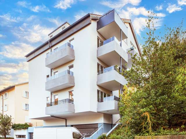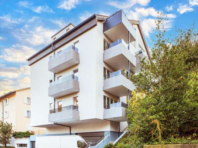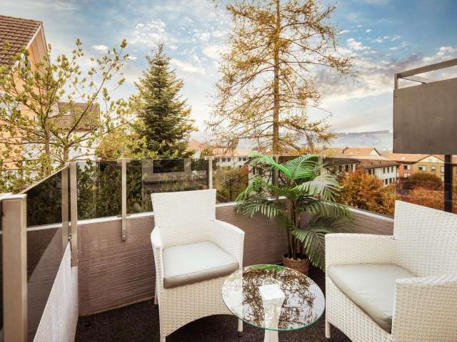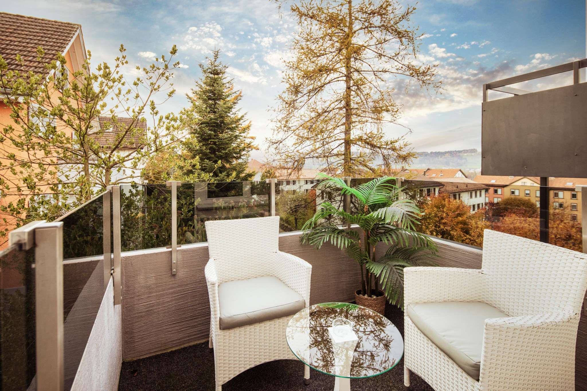 In der hellen und mondän eingerichteten Wohnung schlafen die Gäste komfortabel in einem Kingsize-Boxspringbett (180x200cm). Auf dem Balkon lassen sich schöne Sonnenstunden mit Blick auf das voralpine Panorama geniessen.