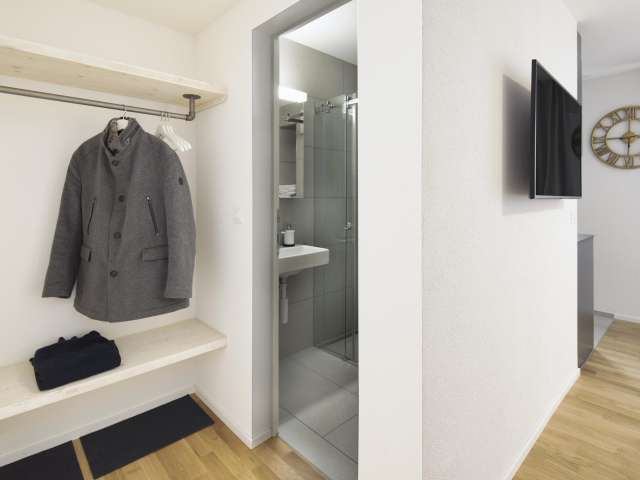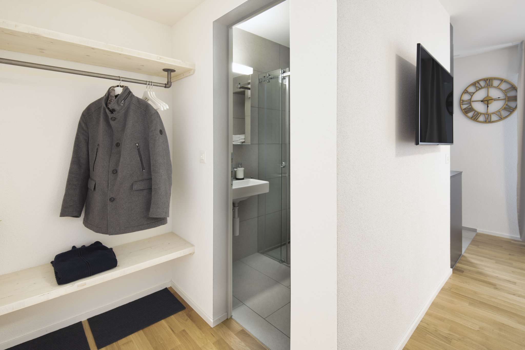 Eine Garderobe und Schrank bieten viel Platz für Kleider und Gepäck. Für die Unterhaltung an ruhigeren Tagen steht nicht nur kostenloses WLAN, sondern auch ein neuer Smart-TV samt Netflix-Konto und ein SunriseTV-Abo zur Verfügung.