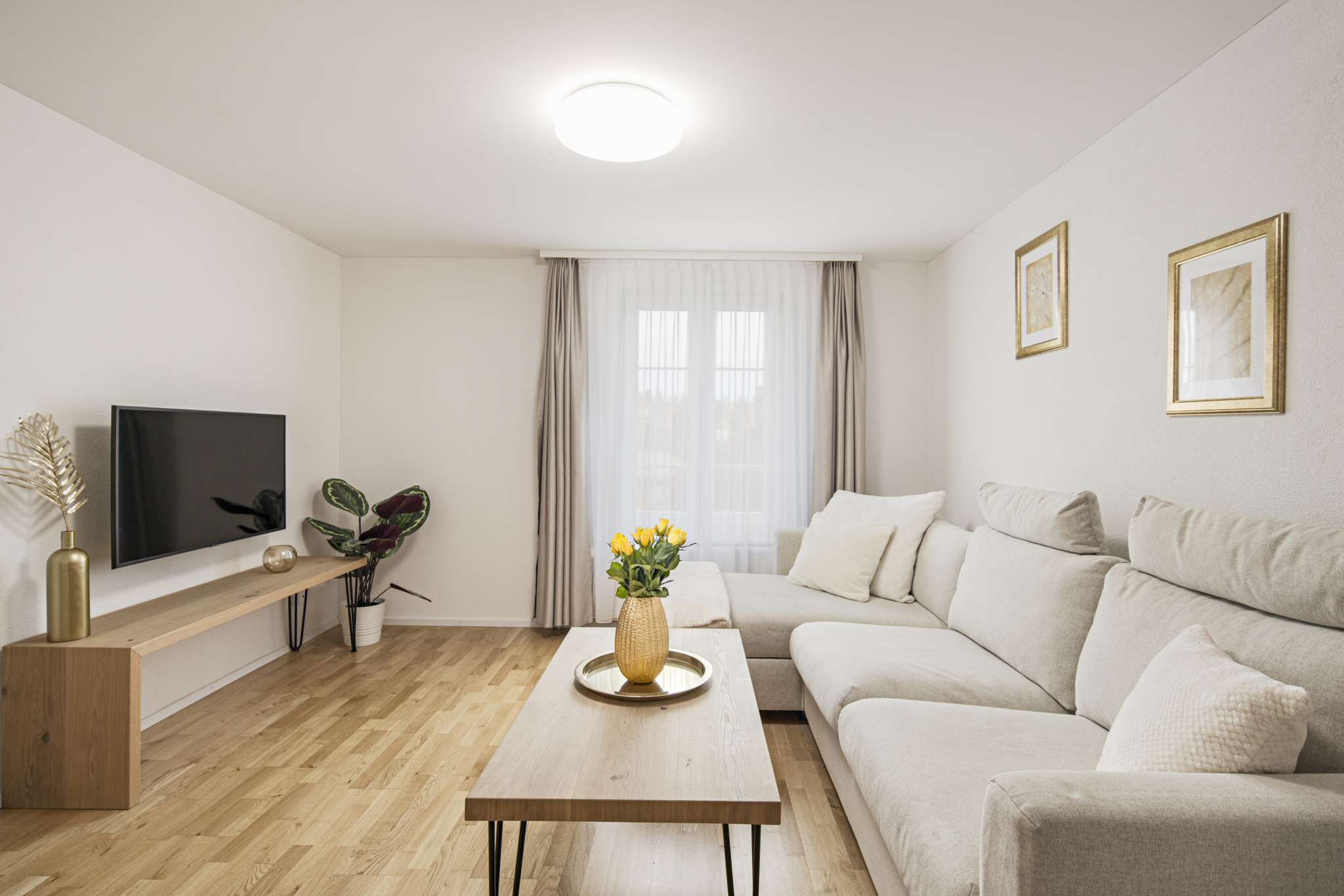 Im Inneren der Suite erwartet die Gäste ein eleganter Mix aus modernem Design und elegantem Holzmobiliar. Das geräumige Schlafzimmer mit dem Kingsize-Boxspringbett (180 x 200 cm) verspricht eine erholsame Nachtruhe. Im gemütlichen und ansprechend gestalteten Wohnzimmer sorgt die bequeme Sofalandschaft mit integriertem Schlafsofa mit Lattenrost (140 x 200 cm) für einen guten Schlaf für zwei weitere Personen. Das Wohn- und Schlafzimmer sind jeweils mit einem grossen Smart-TV mit kostenlosem Netflix und Sunrise TV-Abo ausgestattet. Die Wohnung verfügt über kostenloses WLAN.