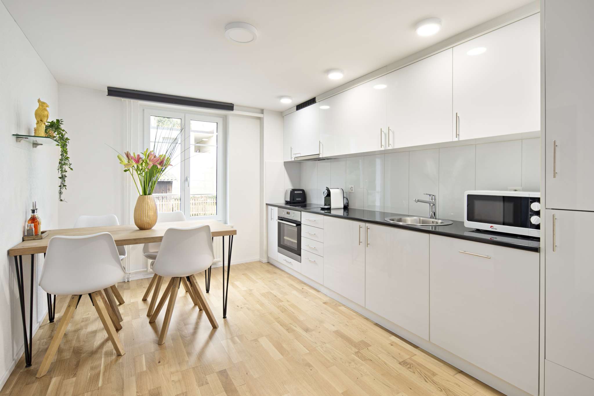 Das exklusive Holzdesign der Suite setzt sich auch im Essbereich fort, in dem sich ein gemütlicher Esstisch befindet, der zu geselligen Abendessen mit Freunden anregt. In der komplett ausgestatteten Küche mit Herd, Geschirrspüler, Kühlschrank, Gefrierschrank, Kaffeemaschine, Tellern, Gläsern und Besteck dürfen die Gäste nach Belieben ihre kulinarischen Wünsche verwirklichen. Das helle und saubere Badezimmer verfügt über einen grossen Duschbereich, eine Waschmaschine sowie einen Trockner. Handseife, Duschgel, Shampoo und frische Handtücher stehen bereit.