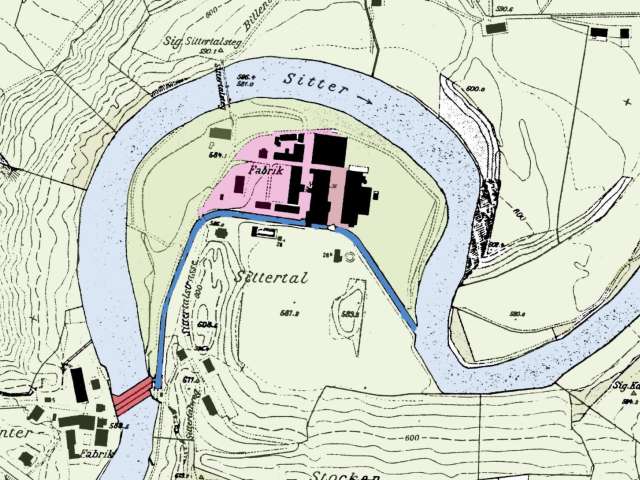 Die Fabrik- und Gebäudeanlagen der ehemaligen Färberei Sitterthal werden von einem Strukturelement geprägt: dem Kanal. Dieser machte in der ersten Bauphase von 1840 die Wasserkraft des Flusses Sitter nutzbar. Das erste Fabrikgebäude wurde rechtwinklig zum Kanal errichtet, wodurch die ganze Länge der Halle direkt von einer Transmissionsanlage bedient werden konnte. Alle nachfolgenden Gebäude und Umbauten orientierten sich an diesem Raster – selbst als die Wasserkraft längst nicht mehr genutzt wurde.