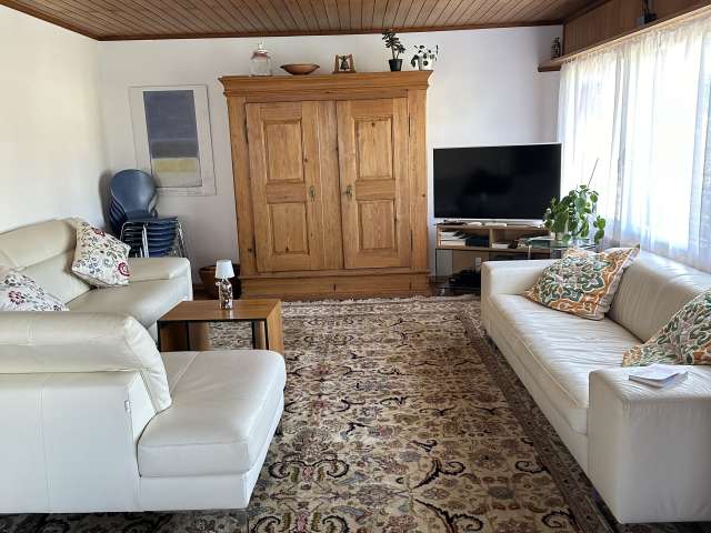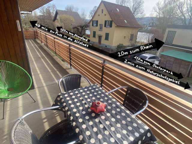 Freistehendes Einfamilienhaus mit riesigem Garten mit Feuerstelle (Grill) und Gartenmöbeln, grosszügige Parkmöglichkeiten, 50m vom Rhein entfernt. In unmittelbarer Nähe des Strandbades und des Naturschutzgebietes "z'Hose". Wenige Gehminuten vom Zentrum entfernt.