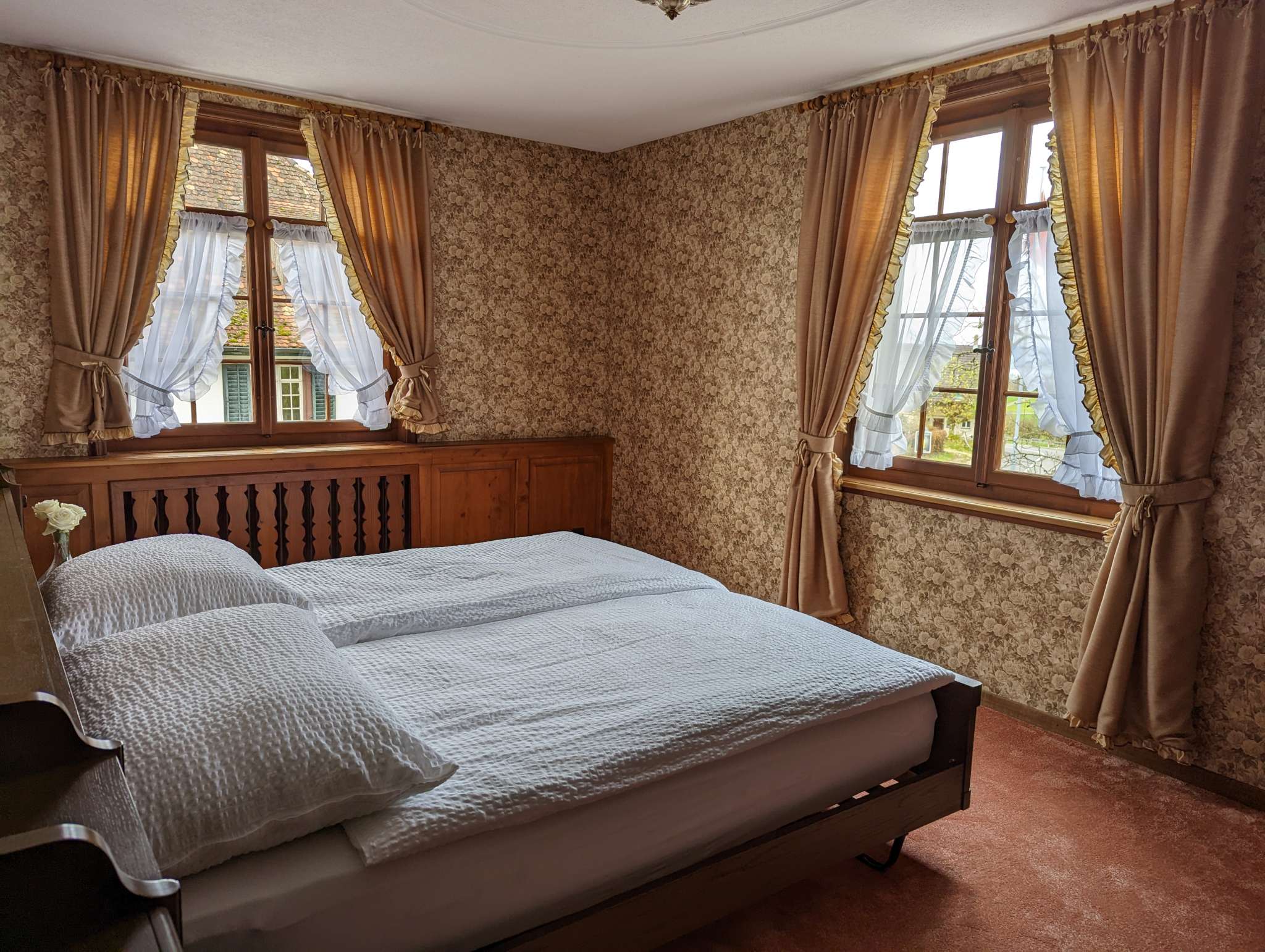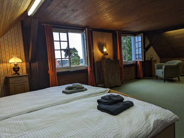 Das Schlössli Herrenhof in Langrickenbach wurde im 18. Jahrhundert als Sitz einer einflussreichen Familie erbaut, verfiel aber nach einigen Besitzerwechsel zunehmend. Eine Kreuzlinger Unternehmerfamilie erwarb und päppelte es wieder auf. Heute steht Schloss Herrenhof als Veranstaltungsort und prachtvolle Unterkunft Gästen zur Verfügung. Im Haupthaus gibt es fünf Doppelzimmer, eines davon im Dachgeschoss mit Blick auf den Bodensee. Der historische Kartoffelkeller eignet sich für Feste wie Hochzeiten oder Geburtstagspartys mit besonderem Ambiente. Ein riesiger Kamin (es darf gegrillt werden) und historische Einrichtung mit viel Holz erzeugen eine gemütlich rustikale Atmosphäre. Gaming-Raum mit Tischtennis, Billard und weiteren Spielen sowie ein riesiger Garten mit Gasgrill und viel Privatsphäre vervollständigen den Freizeitspass. Für zehn zusätzliche Gäste im Massenschlag bietet das Nebengebäude Platz. Im Erdgeschoss wohnen die Gastgebenden. Dennoch bleiben 600 Quadratmeter im Schlössli zur alleinigen Nutzung der Gäste.