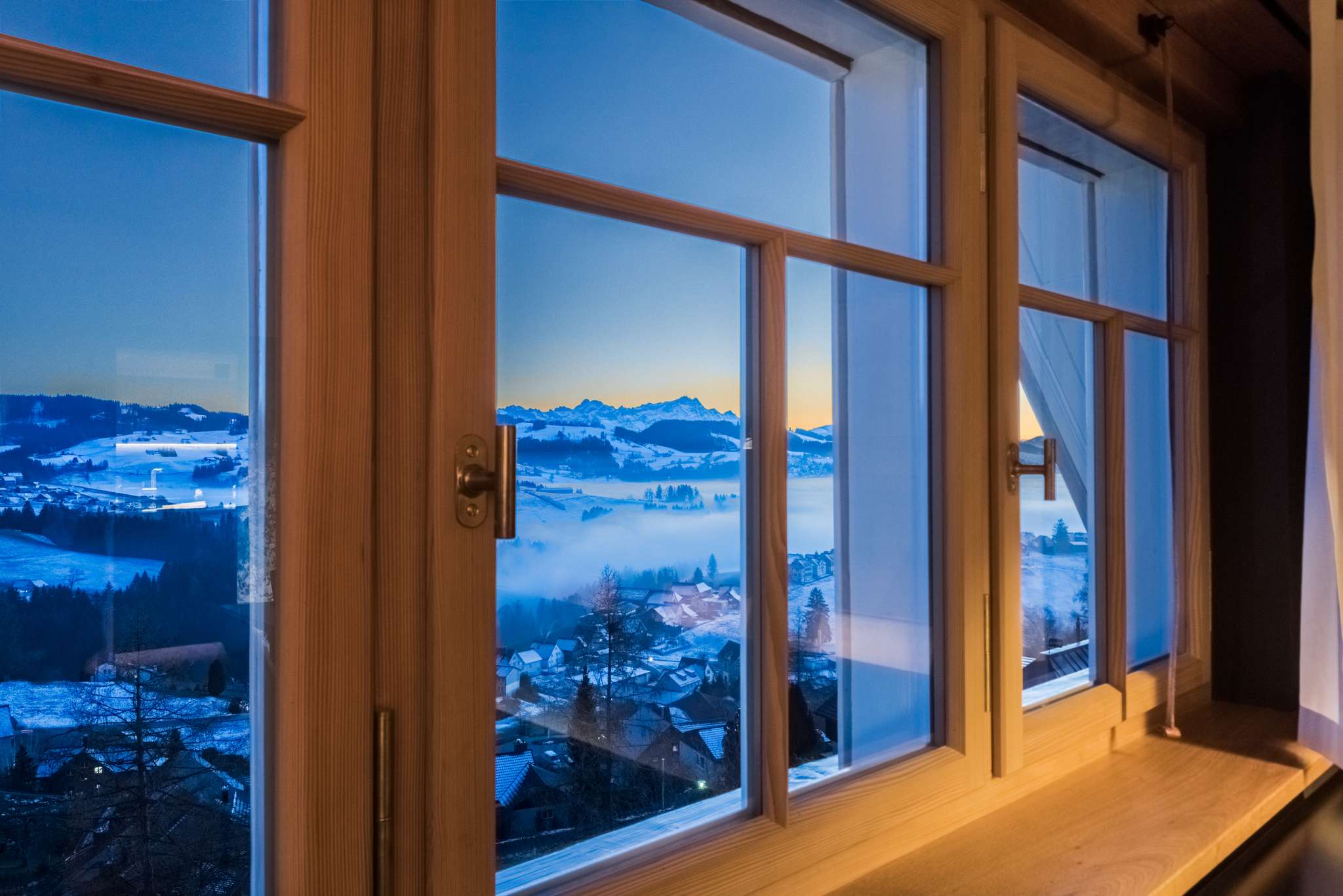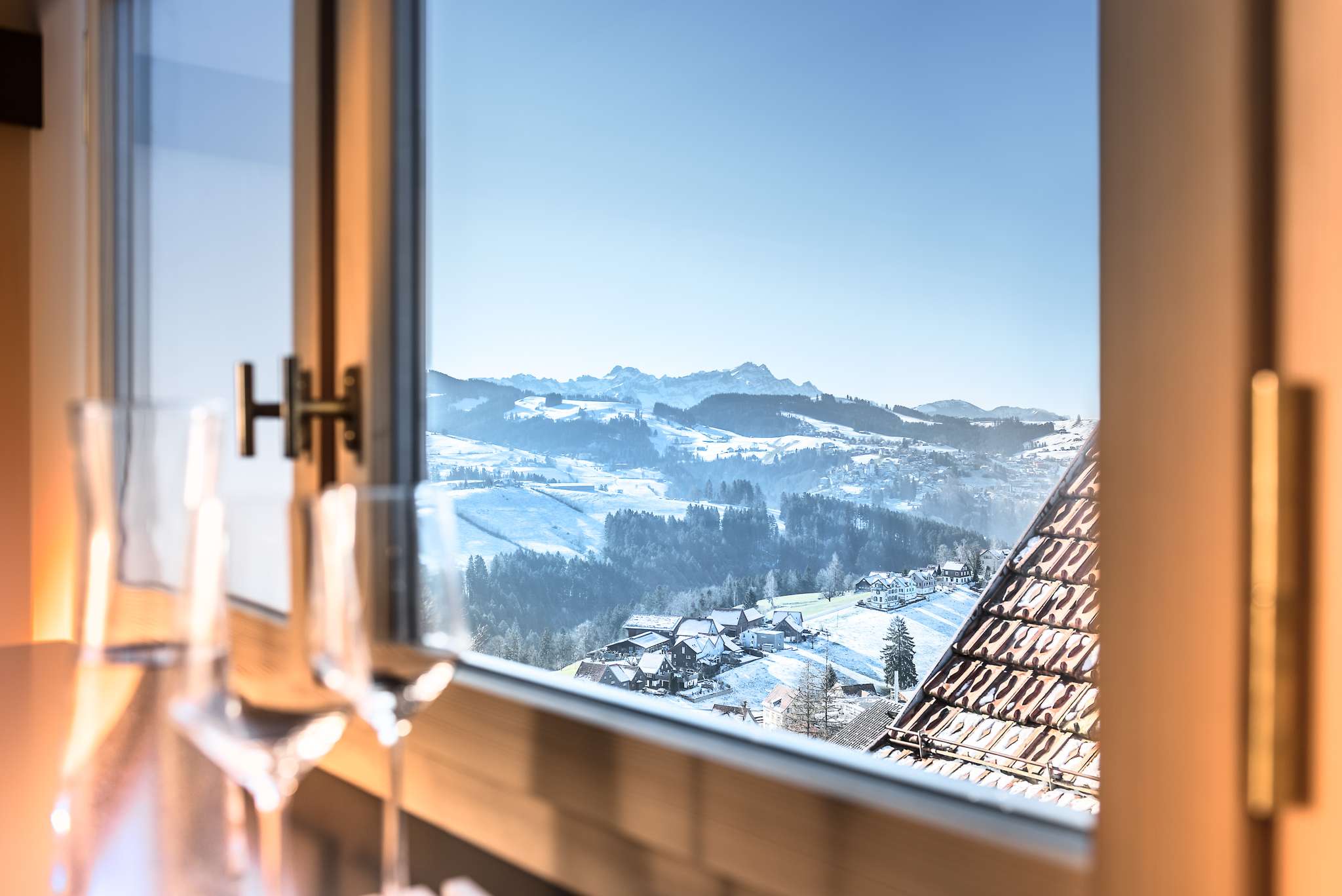 Hier übernachten, mit einzigartigem Blick übers Appenzellerland bis zum Säntis, ist zu allen Jahreszeiten ein Erlebnis.
