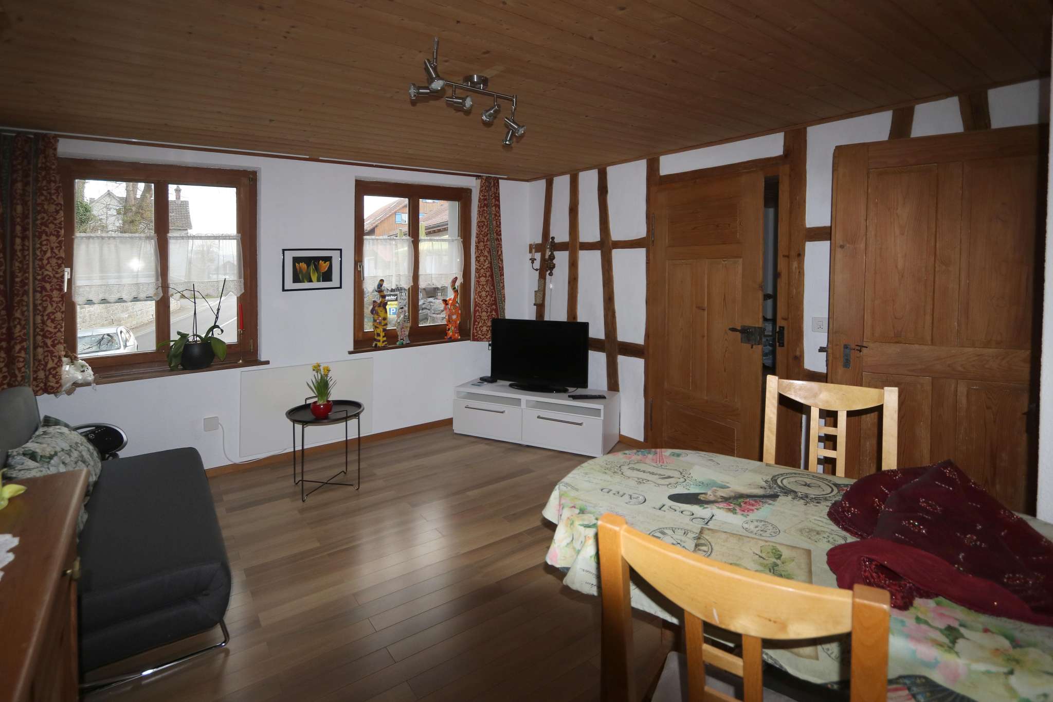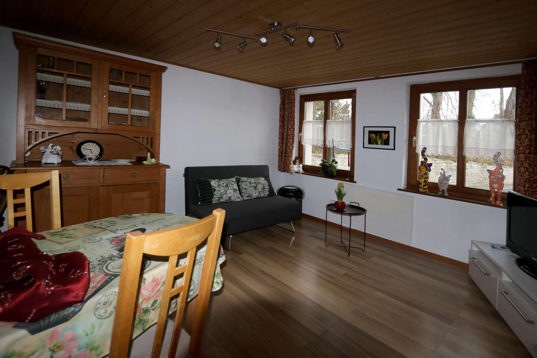 Die Wohnung liegt in einem ehemaligen Bauernhaus und ist teilweise original erhalten mit Riegelwand und Balken. Das Haus liegt in ländlicher Umgebung und bietet eine wundervolle Panoramasicht über den Bodensee.