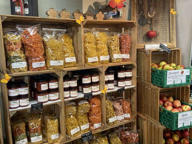 Viele feine auserlesene Spezialitäten aus hofeigenen Produkten wie zB. Eingemachtes, Eingelegtes, Konfitüren, Sirup, Trockenfrüchte, Pestos, Saucen, Joghurts sowie verschiedene Dips, Salatsaucen, Spätzli, Kartoffelsalat, Suppen. Natürlich alles ohne jegliche Zusatzstoffe