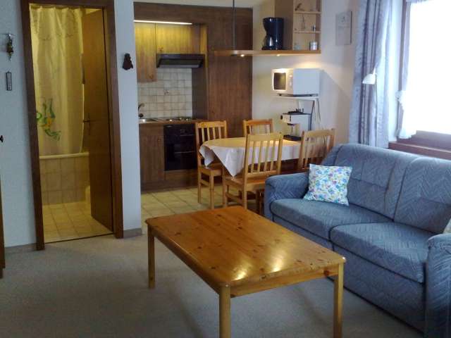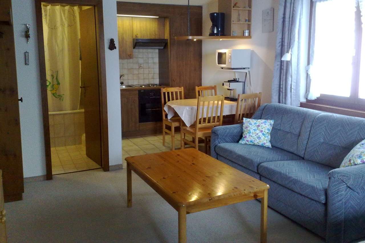 Die Wohnung im Parterre ist gemütlich eingerichtet, mit allem, was man braucht. Schlaf-, Wohn- und Essbereich ist ein Raum und bietet Platz für 2 Personen. Im Sommer steht ein Sitzplatz mit Cheminée zur Verfügung.