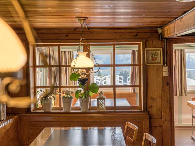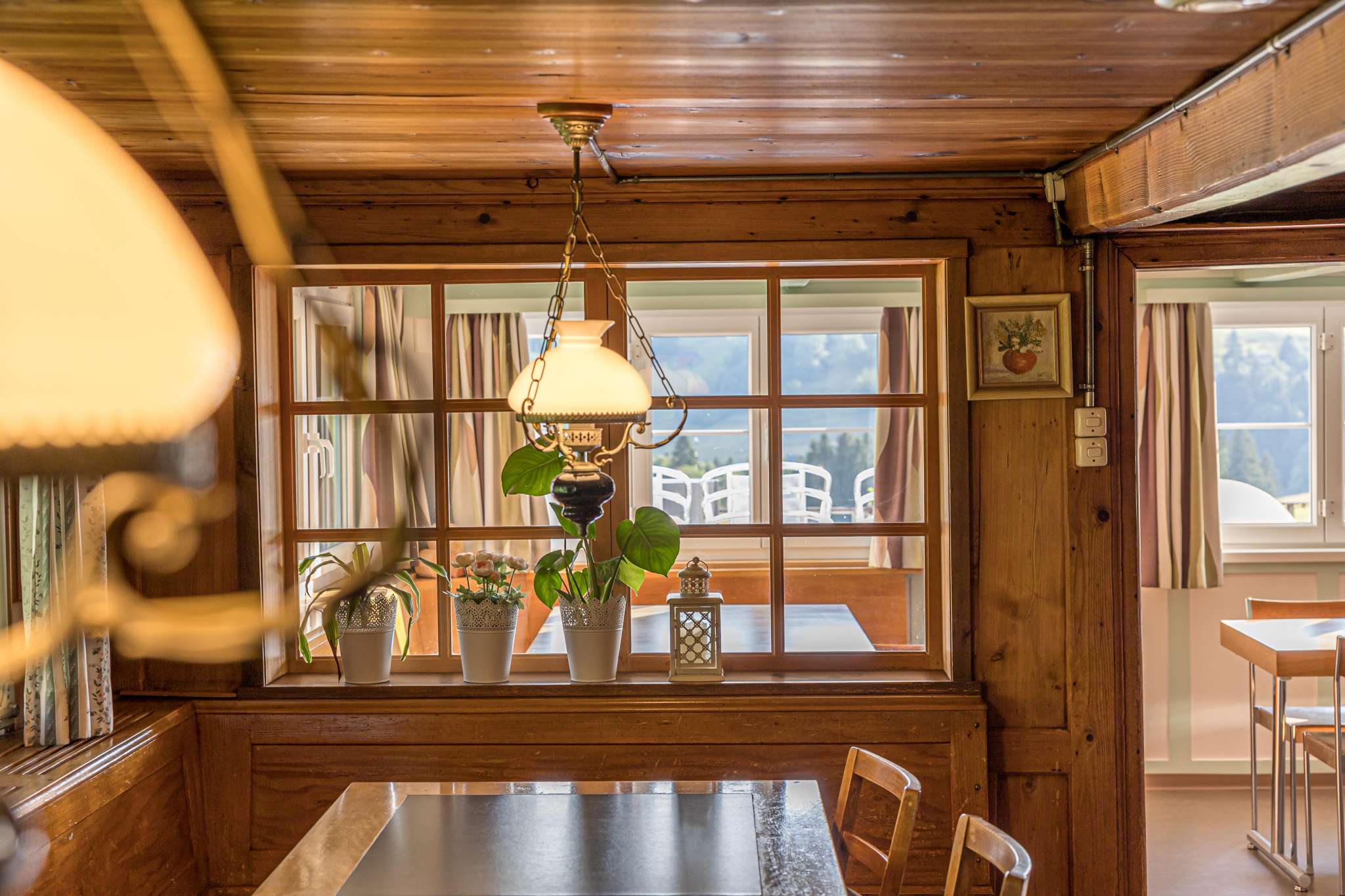 Das angrenzende Sääli mit drei Fensterfronten bietet Licht, Freundlichkeit und eine schöne Aussicht auf das Neckertal und den Hemberg. Dieser Raum hat direkten Zugang zur Terrasse, eine Durchreiche zur Küche, bietet Platz bis zu 25 Personen und wird oftmals als Ess- oder Seminarraum benutzt.