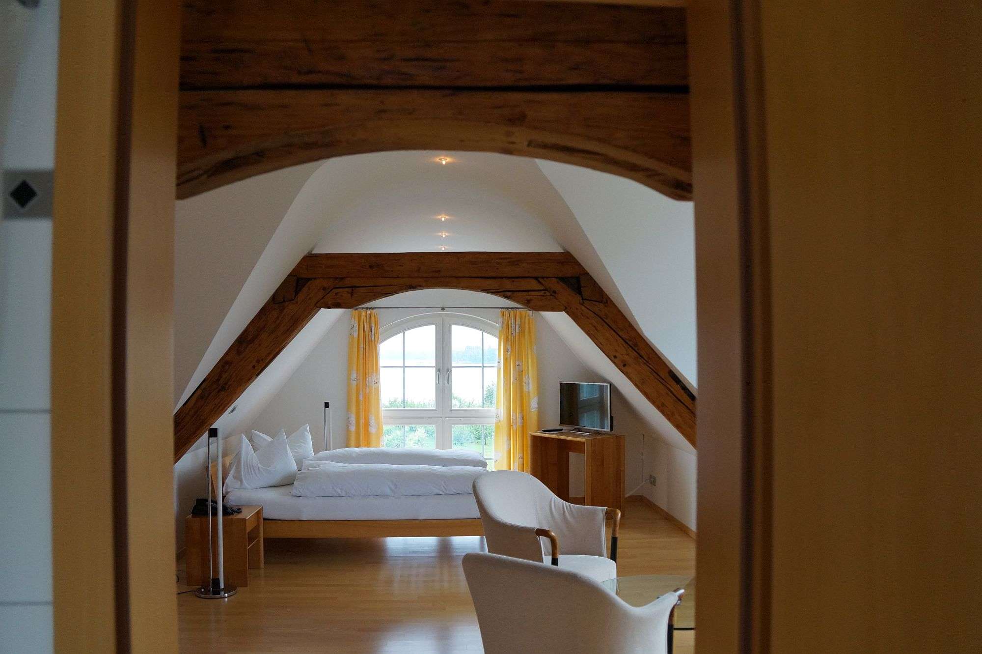 Im Nebengebäude, einem historischen Riegelhaus, befinden sich 7 Hotelzimmer mit herrlicher Sicht auf den Untersee. Das Hotel ist direkt am schönen Bodenseeufer gelegen und bietet alles für einen erholsamen Aufenthalt. Das einfache Doppelzimmer, das Zimmer für den einzelnen Gast oder die geräumige Suite für Anspruchsvolle – alle Zimmer sind liebevoll eingerichtet und bieten angenehmen Komfort.