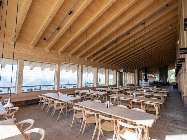 Ein Ort der Ruhe und des Genusses Hoch oben auf dem Chäserrugg, dem östlichsten der sieben Churfirsten, erwartet Sie das Gipfelrestaurant Chäserrugg. Auf 2'262 Metern über Meer bietet es nicht nur kulinarische Höhepunkte, sondern auch einen atemberaubenden Panoramablick über sechs Länder. Ob bei strahlendem Sonnenschein oder mystischem Nebel – hier erleben Sie eindrückliche Momente inmitten der alpinen Landschaft. Architektur im Einklang mit der Natur Das von Herzog & de Meuron entworfene Gipfelgebäude fügt sich harmonisch in die Bergwelt ein. Verwendet wurden unbehandelte Hölzer aus der Schweiz – Fichte und Esche – die der Architektur eine schlichte Eleganz und regionale Authentizität verleihen. Die grosszügigen Fensterfronten eröffnen spektakuläre Ausblicke, während die durchdachte Raumgestaltung sowohl Rückzugsorte als auch gesellige Plätze schafft. Rahmenprogramme für unvergessliche Erlebnisse Die Hochebene Rosenboden lädt zu gemütlichen Wanderungen ein. Der Panoramarundweg bietet faszinierende Ausblicke auf über 500 Berggipfel und den Walensee. Für Interessierte werden Architekturführungen angeboten, die spannende Einblicke in die Entstehung und Gestaltung des Gipfelgebäudes geben. Anreise – bequem und barrierefrei Die Anreise zum Chäserrugg gestaltet sich komfortabel: Von Unterwasser gelangen Sie mit der Standseilbahn nach Iltios und von dort mit der Luftseilbahn direkt zum Gipfel. Beide Bahnen sind rollstuhlgängig, und auch das Gipfelgebäude.