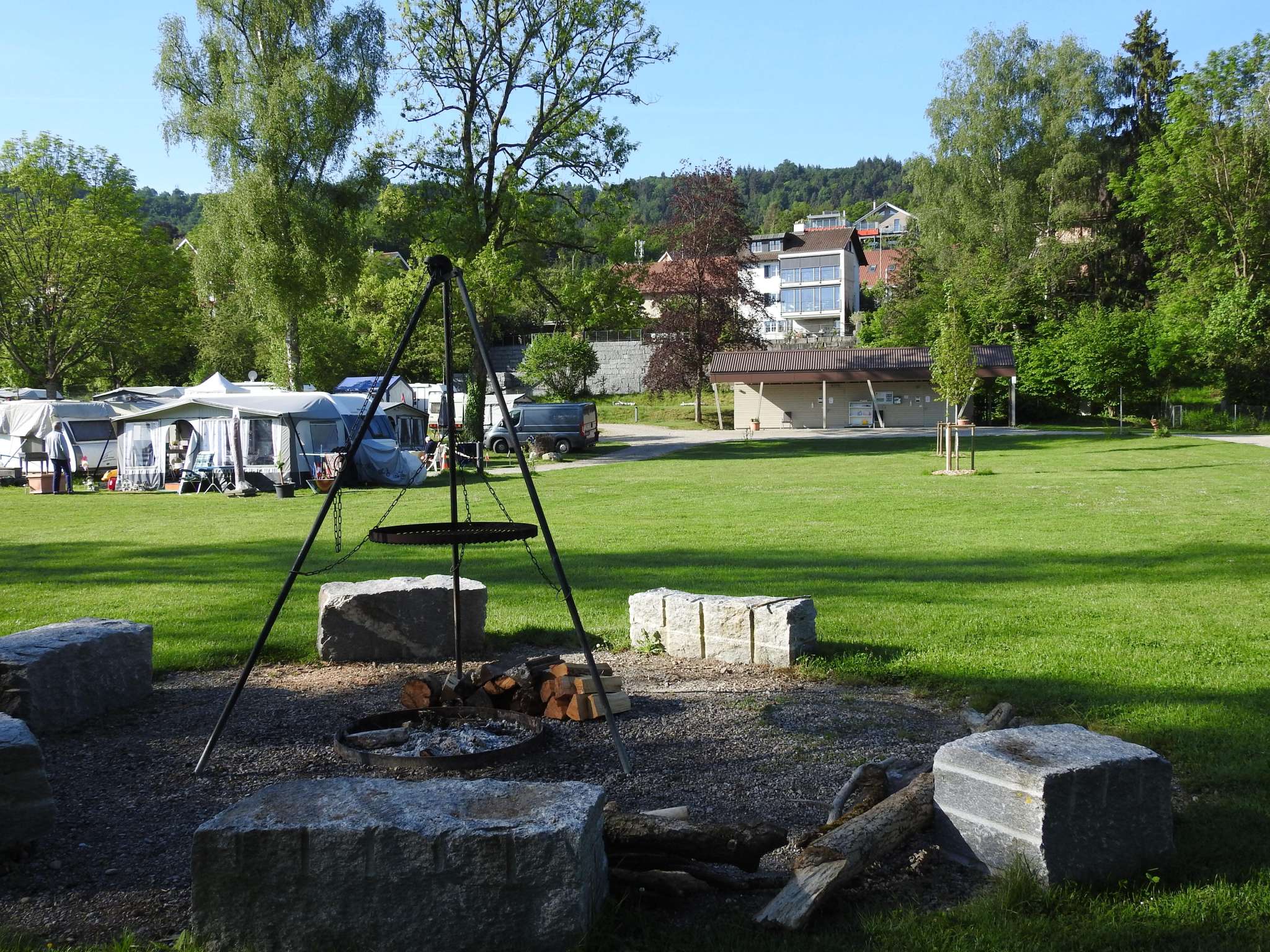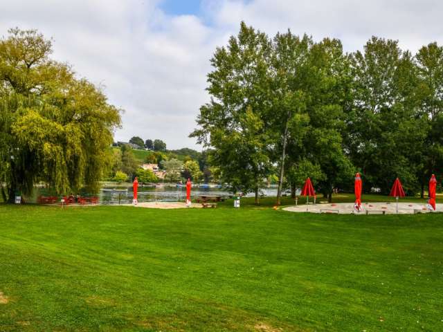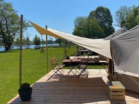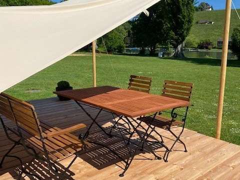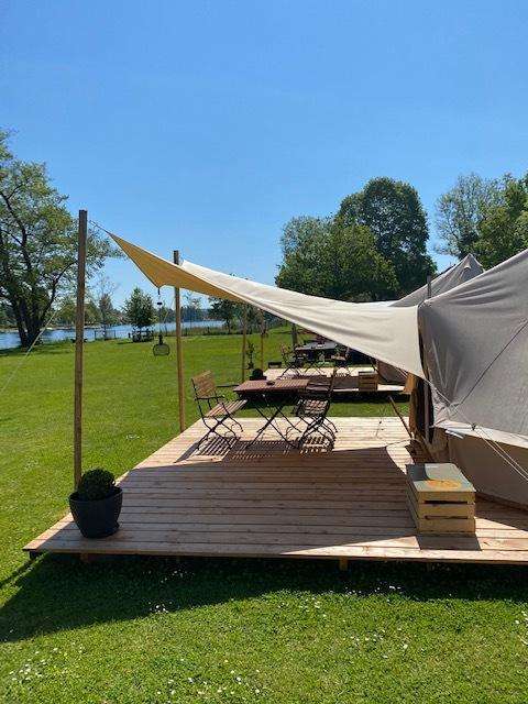 Von der gemütlichen Holzterrasse hat man eine wunderschöne Aussicht auf den Rhein und die Natur, welche mit einem Abendessen und einem Glas Wein genossen werden kann. Das Sonnensegel vor dem Zelt spendet Schatten oder auch Schutz bei Regen. Die Zelte befinden sich in der Nähe des Grillplatzes, wo Holz für ein Barbecue oder für ein schönes Lagerfeuer zur Verfügung steht.