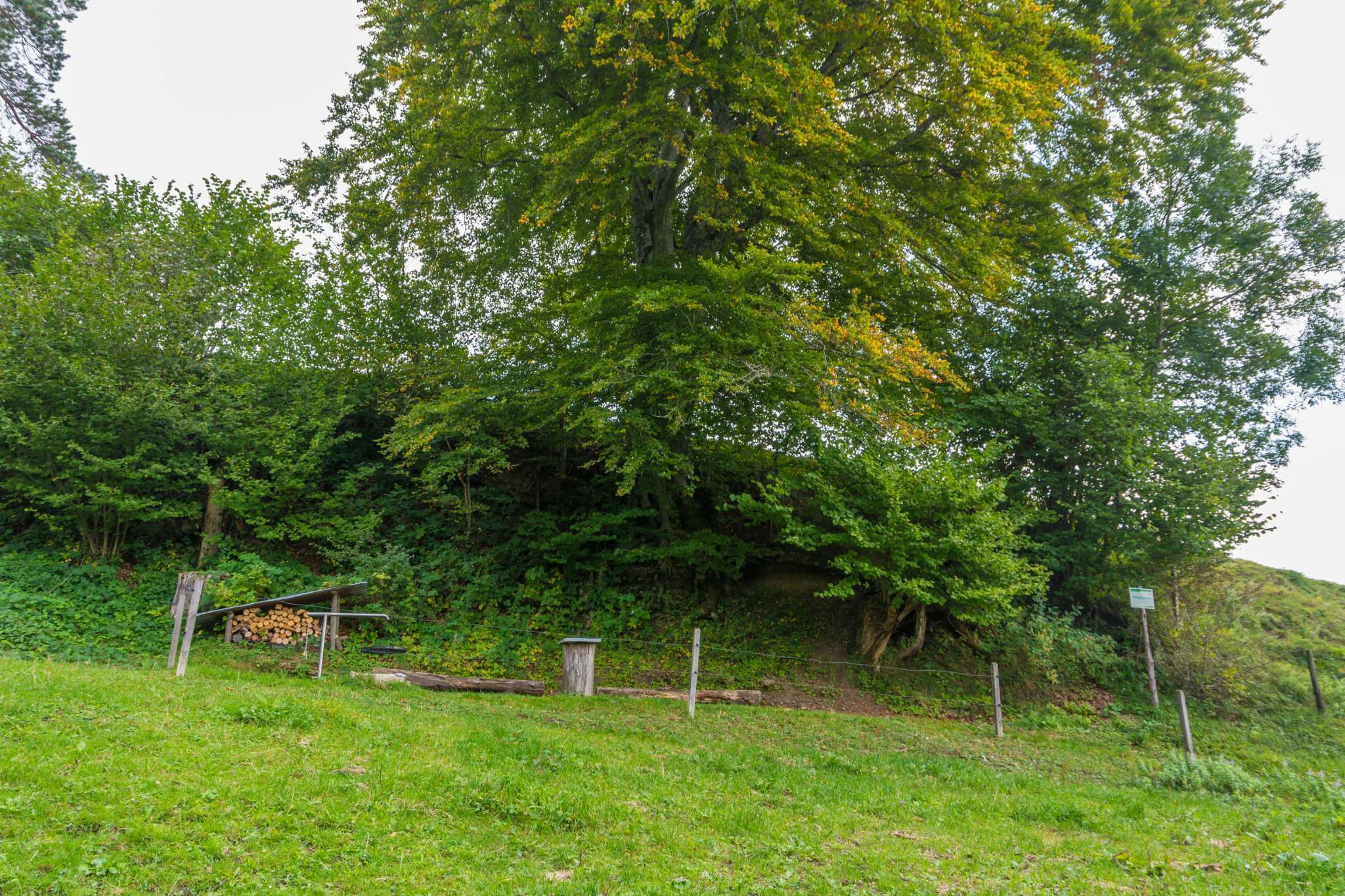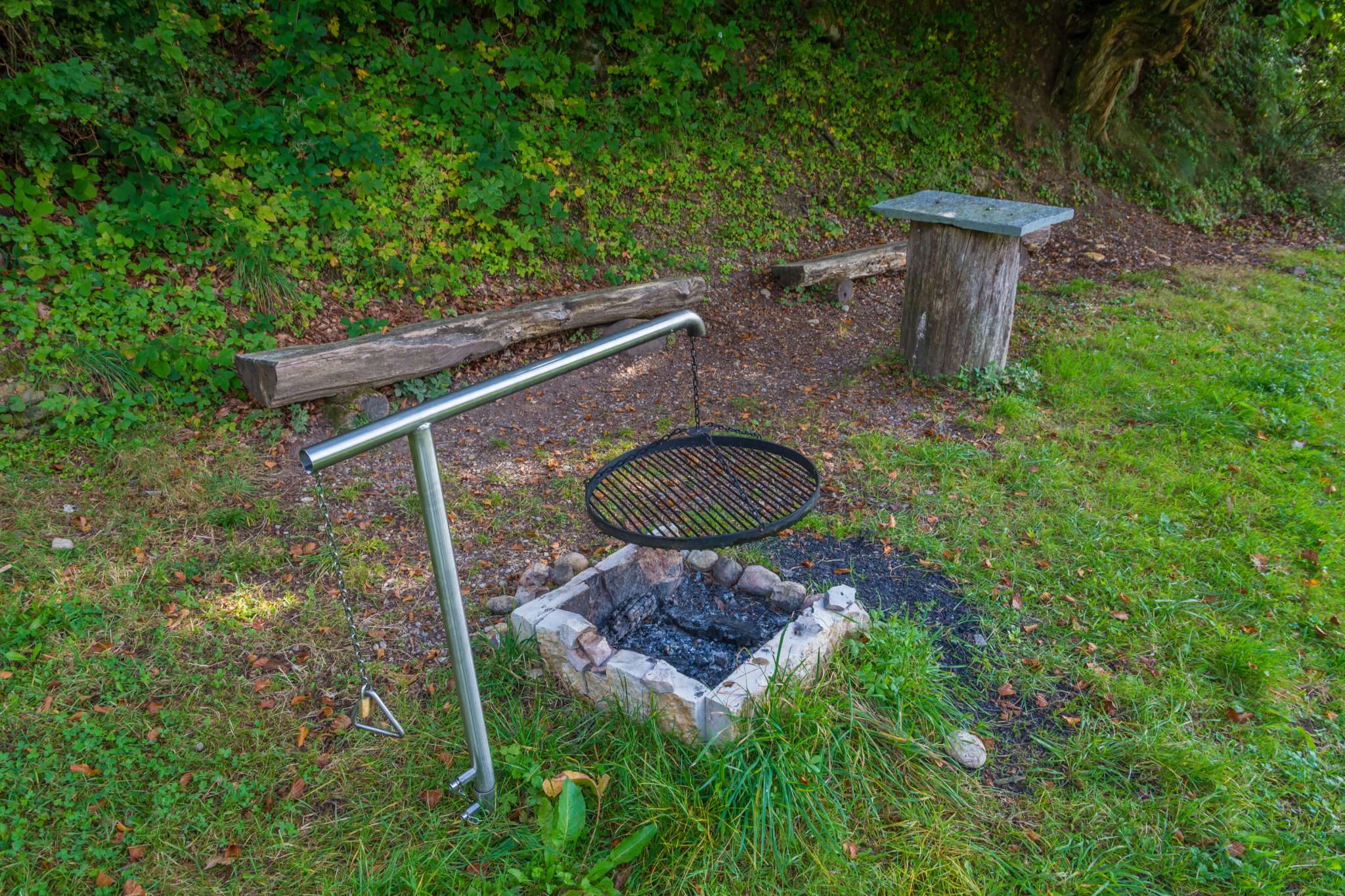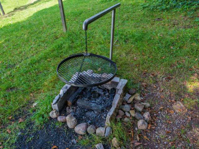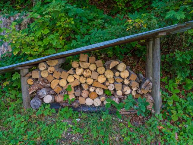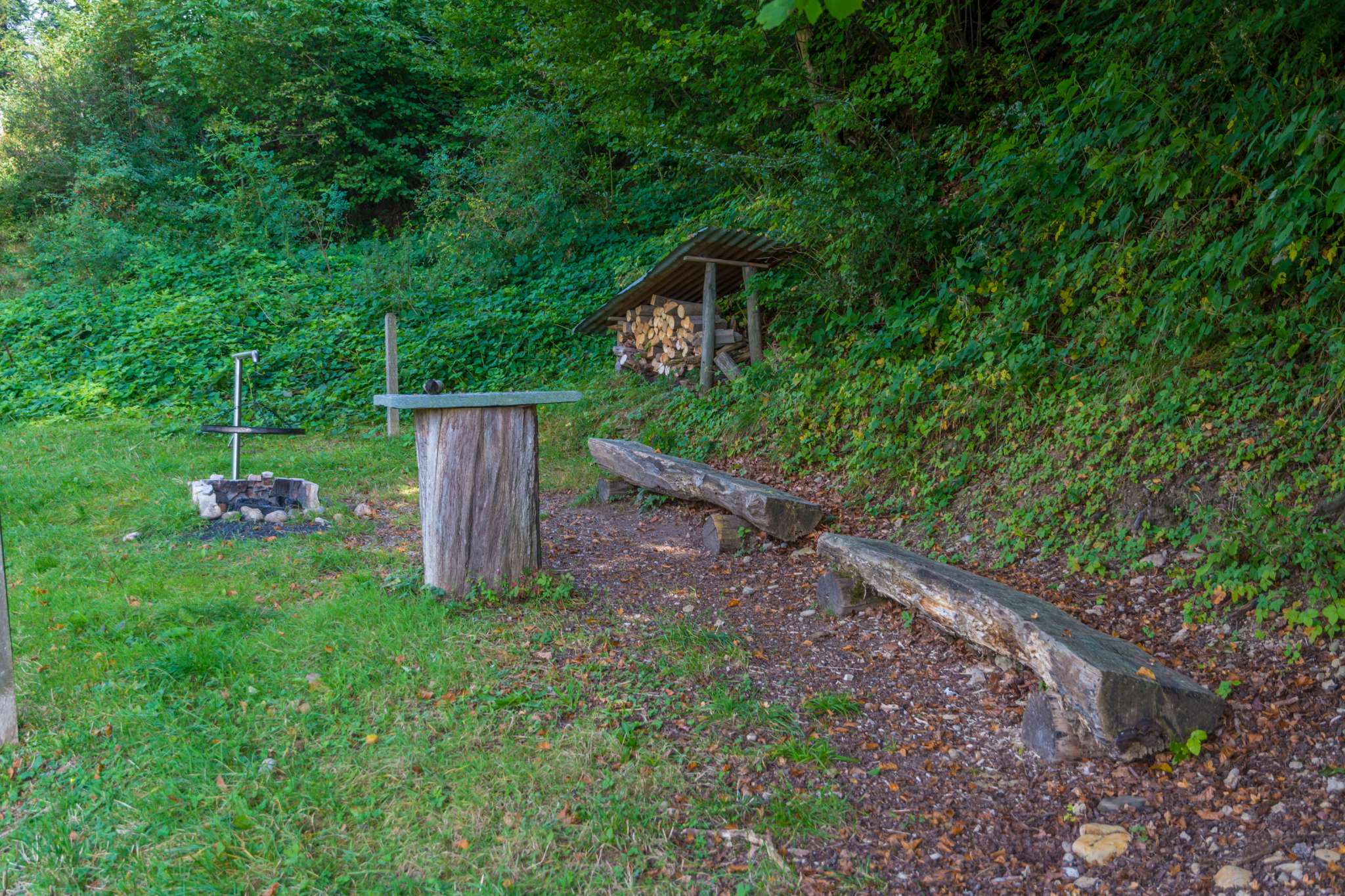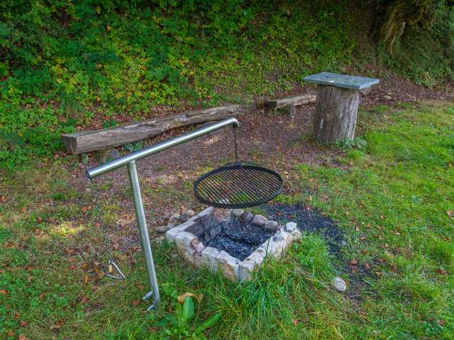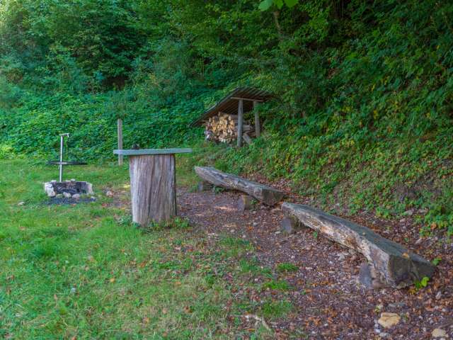 Lauschiger Grillplatz mit Holz und Bänken.