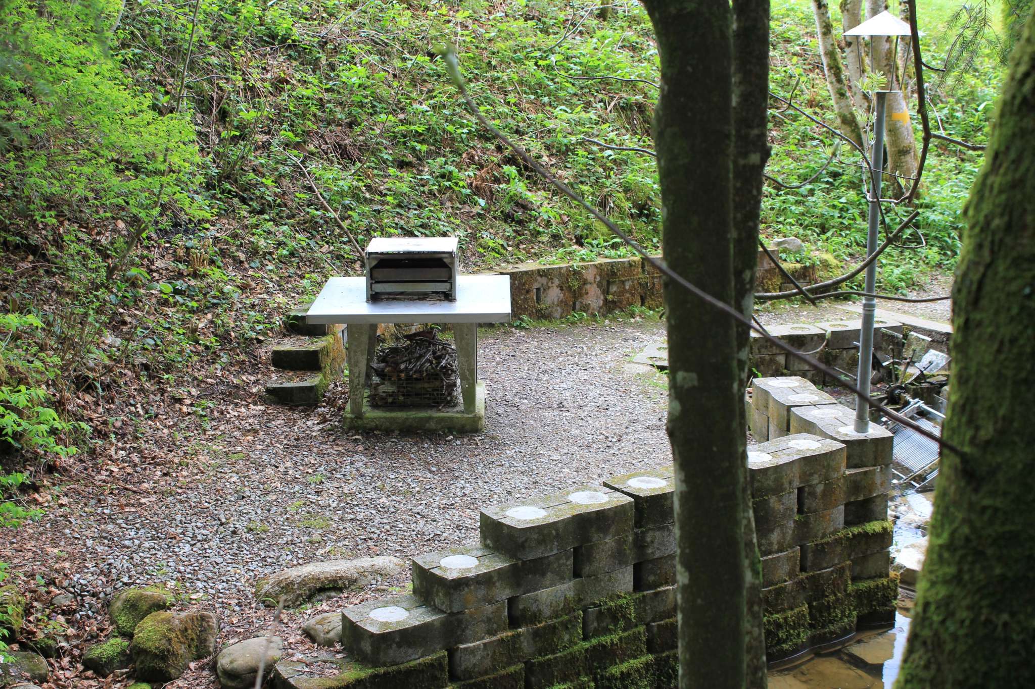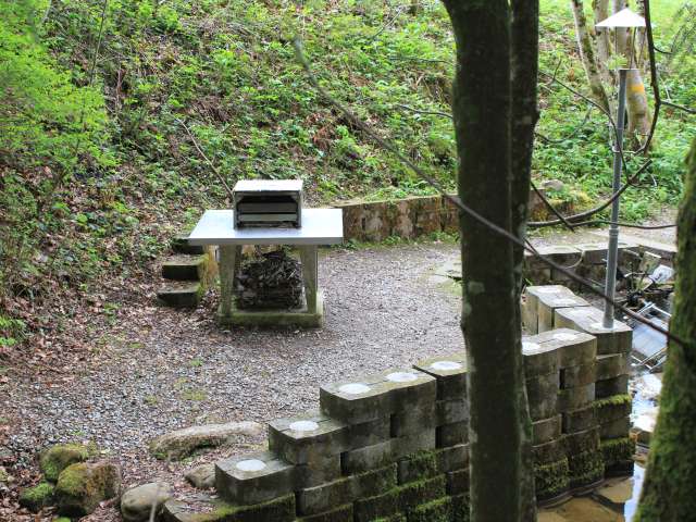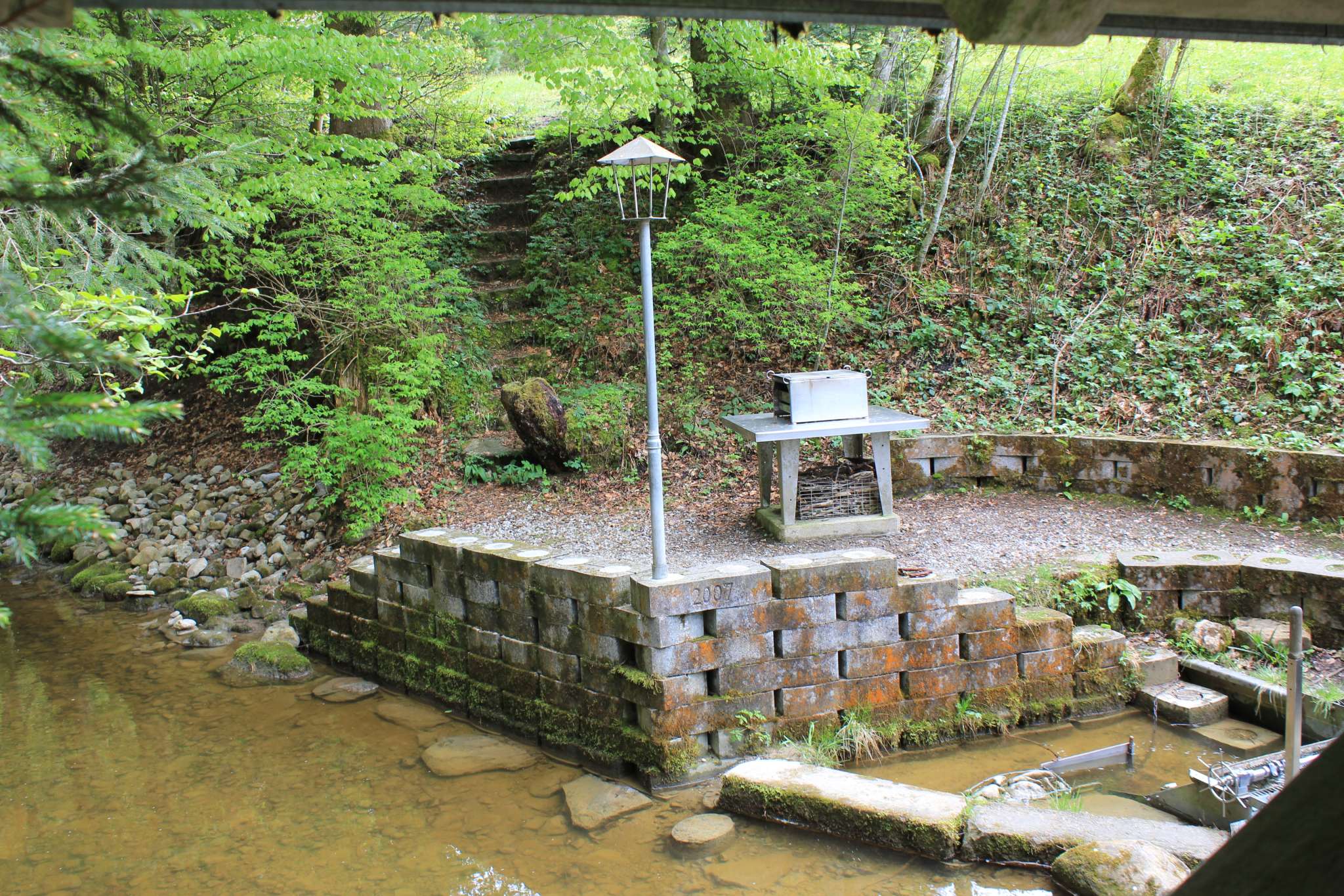 Währenddem das Essen auf dem Rost grilliert wird, können das kleine Wasserrad bestaunt und die dritte Station vom Kneippweg mit Wassertreten ausprobiert werden. Sitzmöglichkeiten stehen mit der Mauer gewisse zur Verfügung.