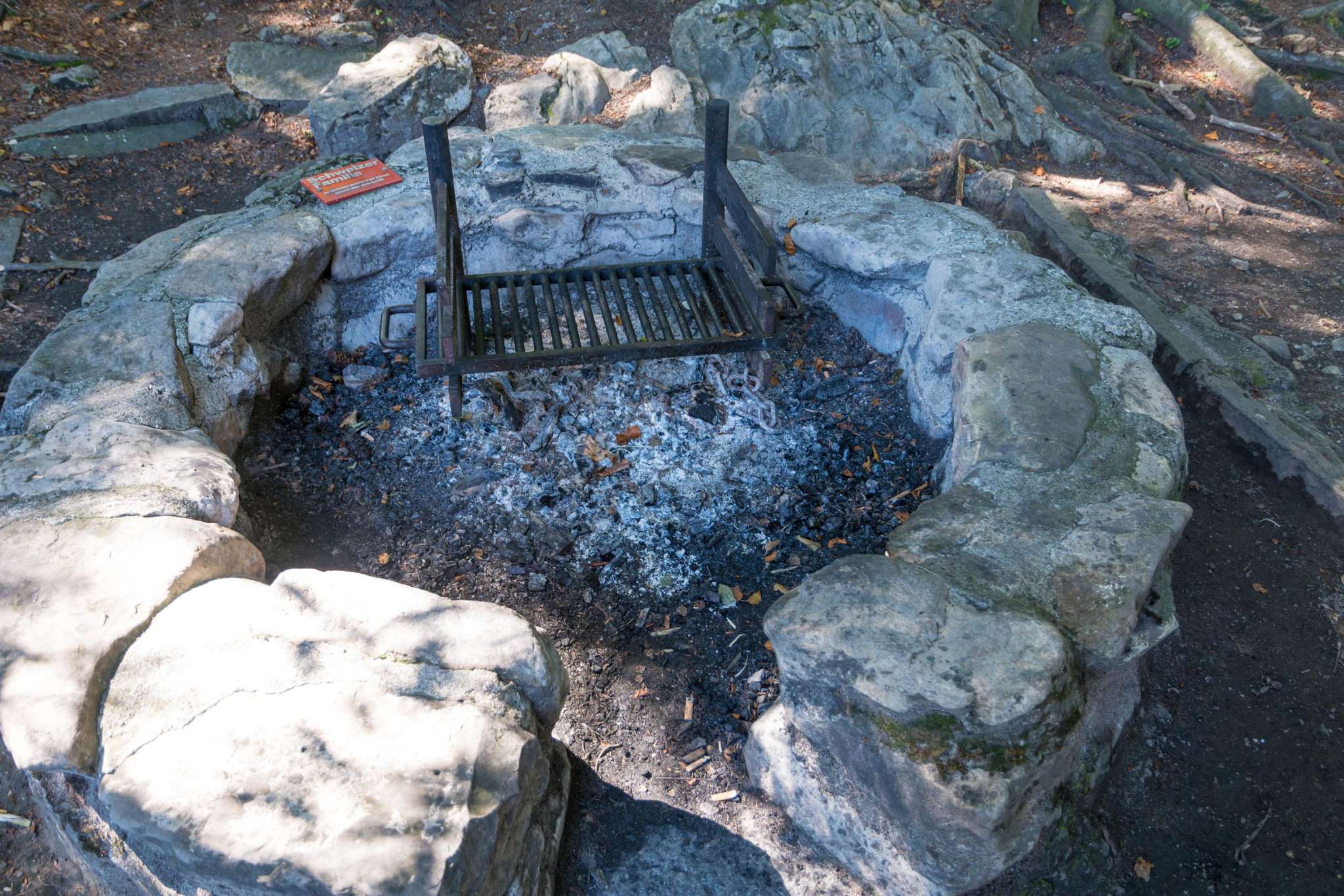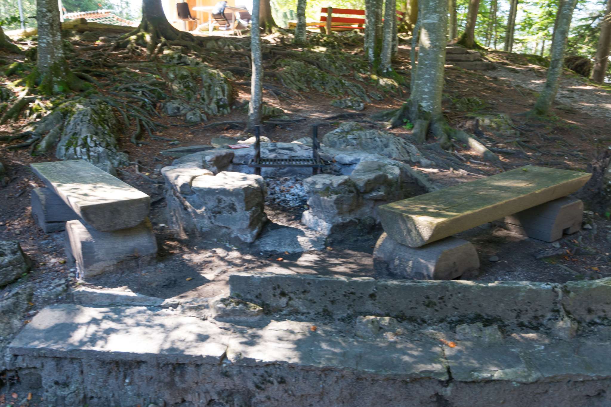 Die Feuerstelle ist rund gemauert und verfügt über einen rechteckigen Rost, der in drei Stufen höhenverstellbar ist. Die Mitnahme eines Paars Grillhandschuhe wird daher empfohlen.