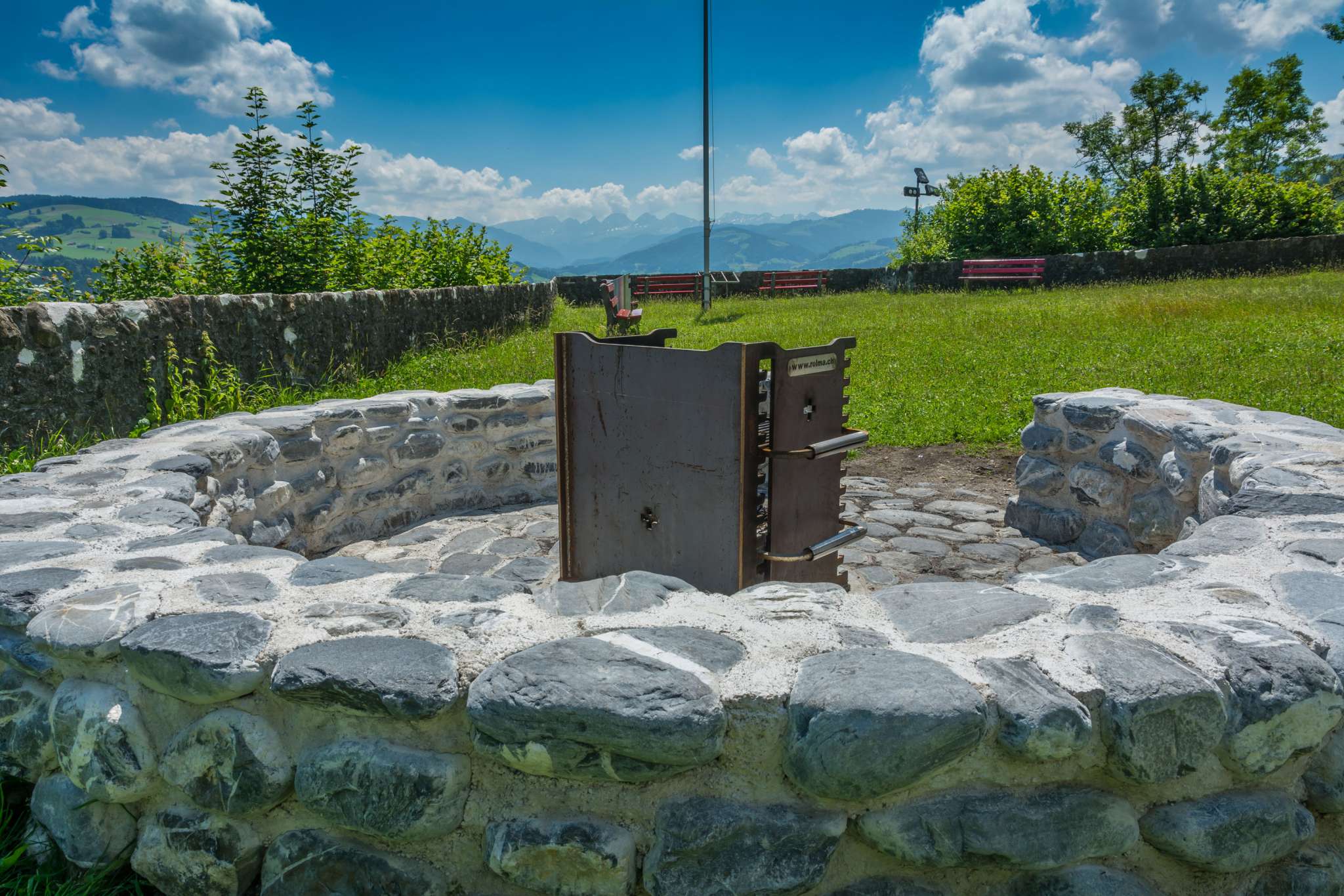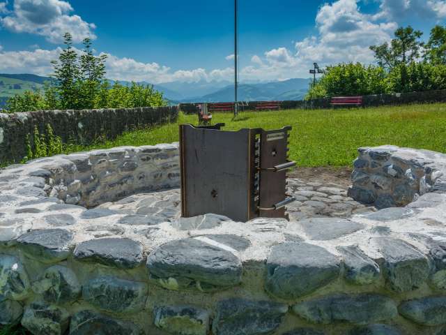 Der Grillplatz Iberg befindet sich im Burghof der Iburg. Man geniesst einen schönen Blick auf Wattwil, den gegenüberliegenden Köbelisberg, talabwärts nach Lichtensteig und talaufwärts nach Ebnat-Kappel. Im Hintergrund ragen die Churfirsten empor. Die Feuerstelle war bis im Frühling 2018 in einem desolaten Zustand. Nun aber erstrahlt sie in neuem Glanz! Ein passiver Romla-Grill steht in einem gemauerten Steinkreis, der nach vorne hin offen ist. Der Rost kann problemlos in der Höhe verstellt werden. Direkt neben der Feuerstelle steht eine Bank, fünf weitere sind verteilt im Innenhof. Unterhalb der Burg, am Fusse der Treppe, findet man einen grossen Holzvorrat. Die Burganlage ist nur von 10 bis 19 Uhr geöffnet, in der Winterzeit sogar ganz geschlossen. Kinderwagentauglich: nein, Holz: ja, Trinkwasser: nein, WC: nein, Kapazität: ca. 16