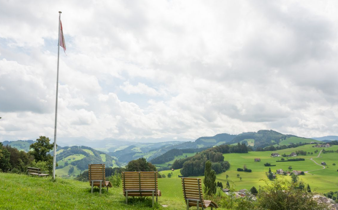 Das Kreuz Oberhelfenschwil ist ein herrlicher Ort. Die Aussicht rundherum ist fantastisch. Auf Holzliegestühlen, die an schönster Lage stehen, kann man das Panorama in aller Ruhe auf sich wirken lassen.