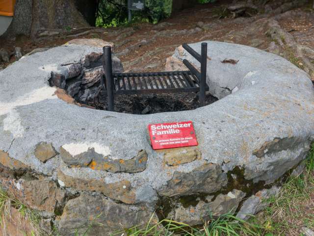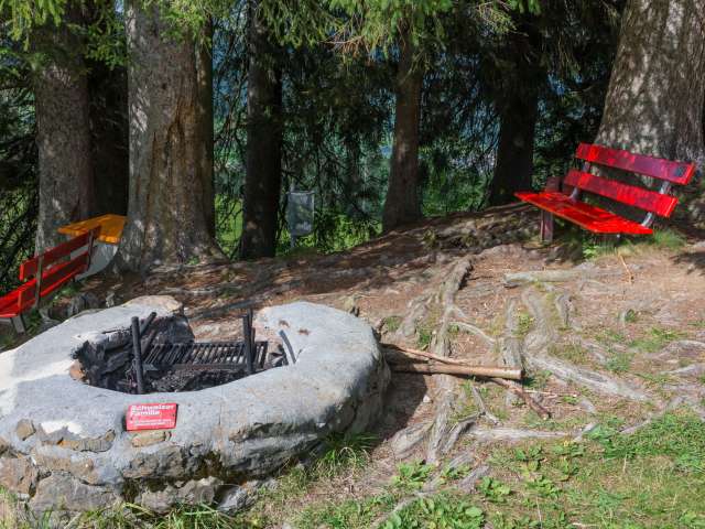 Die Feuerstelle der Schweizer Familie ist rund gemauert und verfügt über einen Rost, der in drei Stufen in der Höhe verstellt werden kann. Dafür sind aber Handschuhe notwendig. Insgesamt gibt es drei Bänke mit Lehne. In einer grossen Kiste findet man einen Holzvorrat. Man blickt Richtung Chäserrugg. Kinderwagentauglich: ja, Holz: ja, Trinkwasser: nein, WC: nein, Kapazität: ca. 12