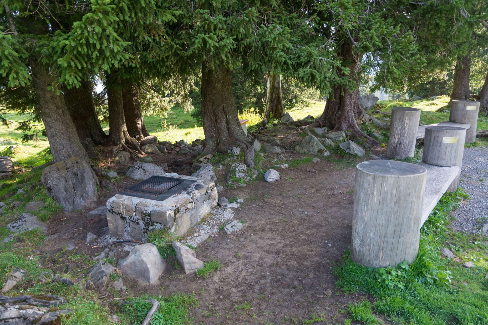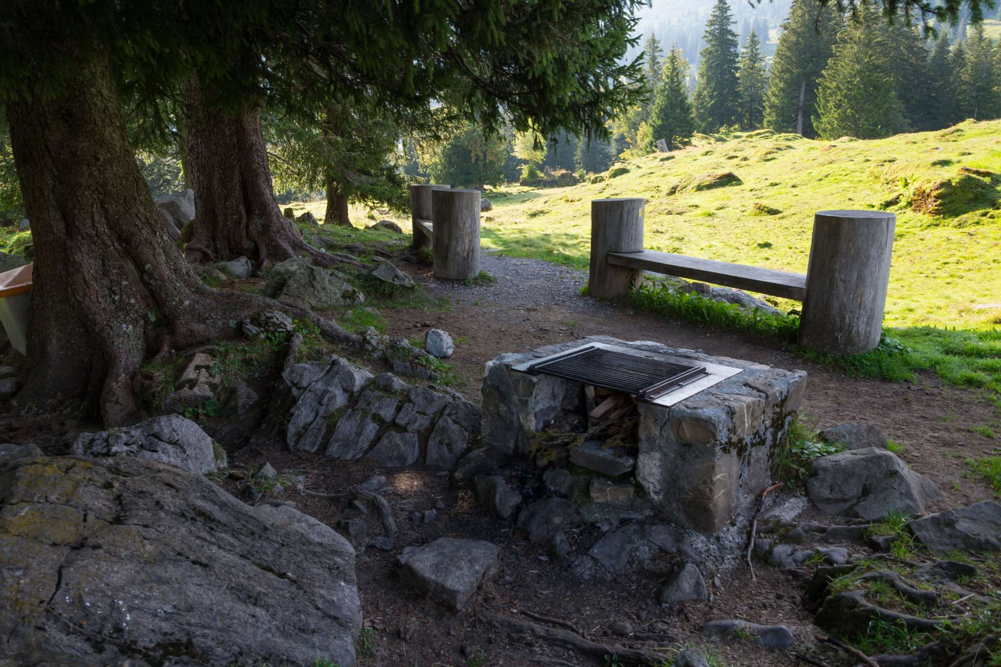 Schattiger Grillplatz am Toggenburger Sagenweg mit fantastischem Ausblick auf die Churfirsten.