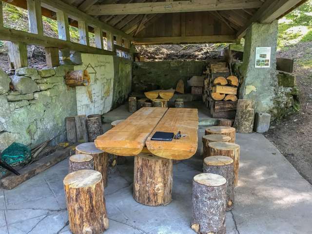 Der Grillplatz liegt zwischen der ehemaligen Skipiste und einem Bach. Unter dem grosszügigen Dach findet man zwei Tische, einen für die Erwachsenen und einen kleineren für die Kinder. Beide Tische sind umgeben von Holztremel, welche als Hocker dienen. Auch hier hat man wieder an die Kinder gedacht und am kleinen Tisch auch kleine Tremel hingestellt. Zusätzlich gibt es noch zwei Ruhebänke direkt am Grillplatz und eine weitere auf der anderen Bachseite. Die Feuerstelle ist von Steinen umgeben und verfügt über einen Rost, der gut in der Höhe verstellt werden kann. Der Rost wird bei Nichtgebrauch unter dem Dach verräumt. Im Unterstand findet man einen grossen Holzvorrat und auch etwas Zeitungspapier. Wem das Schwefelwasser nicht schmeckt, der hat Glück: Direkt am Grillplatz findet man nämlich auch einen Brunnen mit Quellwasser vom Stockberg! Das Schwefelwasser plätschert in einen Brunnen etwas weiter unten. Besucher des Grillplatzes können sich in einem Gästebuch eintragen und auch ein Fotoalbum anschauen, in welchem man Bilder der Bauarbeiten betrachten kann. Kinderwagentauglich: nein, Holz: ja, Trinkwasser: ja, WC: nein, Kapazität: ca. 8