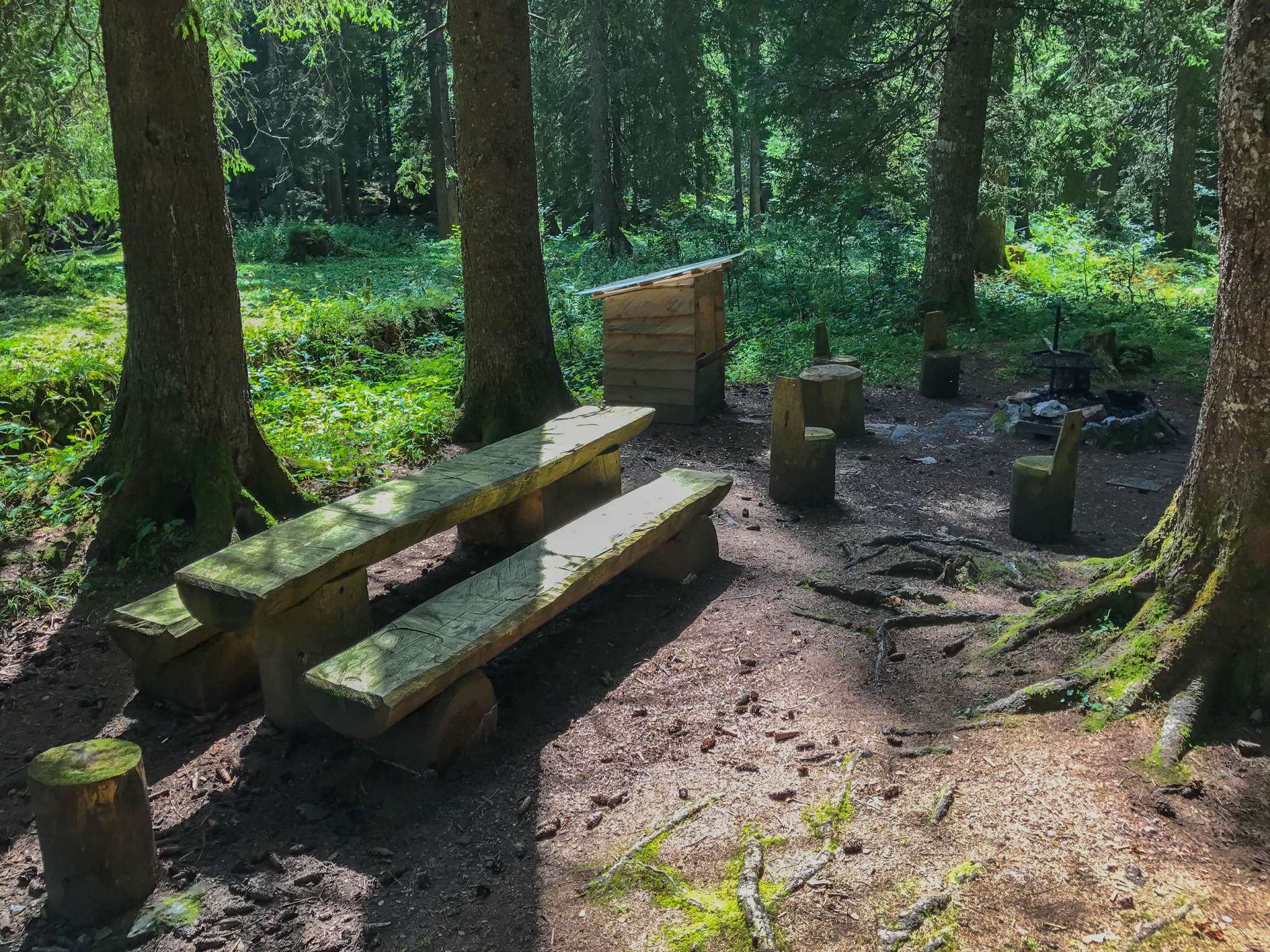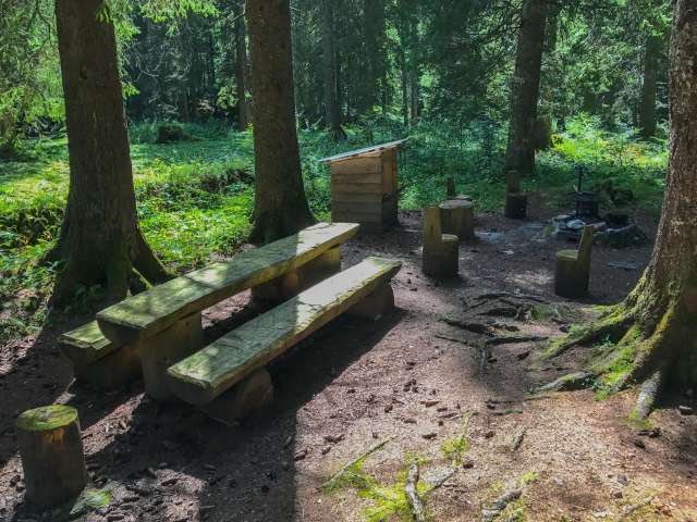 Der Grillplatz Stelzenboden liegt wunderbar ruhig im Bannwald im Schatten hoher Fichten. Zwischen den Bäumen kann man sehr gut eine Slackline aufspannen. Vom Grillplatz aus hat man einen sehr schönen Blick auf den Säntis. Die Feuerstelle ist rund gemauert und verfügt über einen rechteckigen Rost, der gut in der Höhe verstellt werden kann. Rund ums Feuer herum stehen eine Bank und einige Hocker, teilweise mit Lehne. Gleich daneben steht ein kleiner Holzunterstand, in welchem man Holz fürs Feuer und auch etwas Zeitungspapier vorfindet. Zum Essen steht ein Tisch mit zwei Bänken zur Verfügung. Kinderwagentauglich: ja, Holz: ja, Trinkwasser: nein, WC: nein, Kapazität: ca. 18