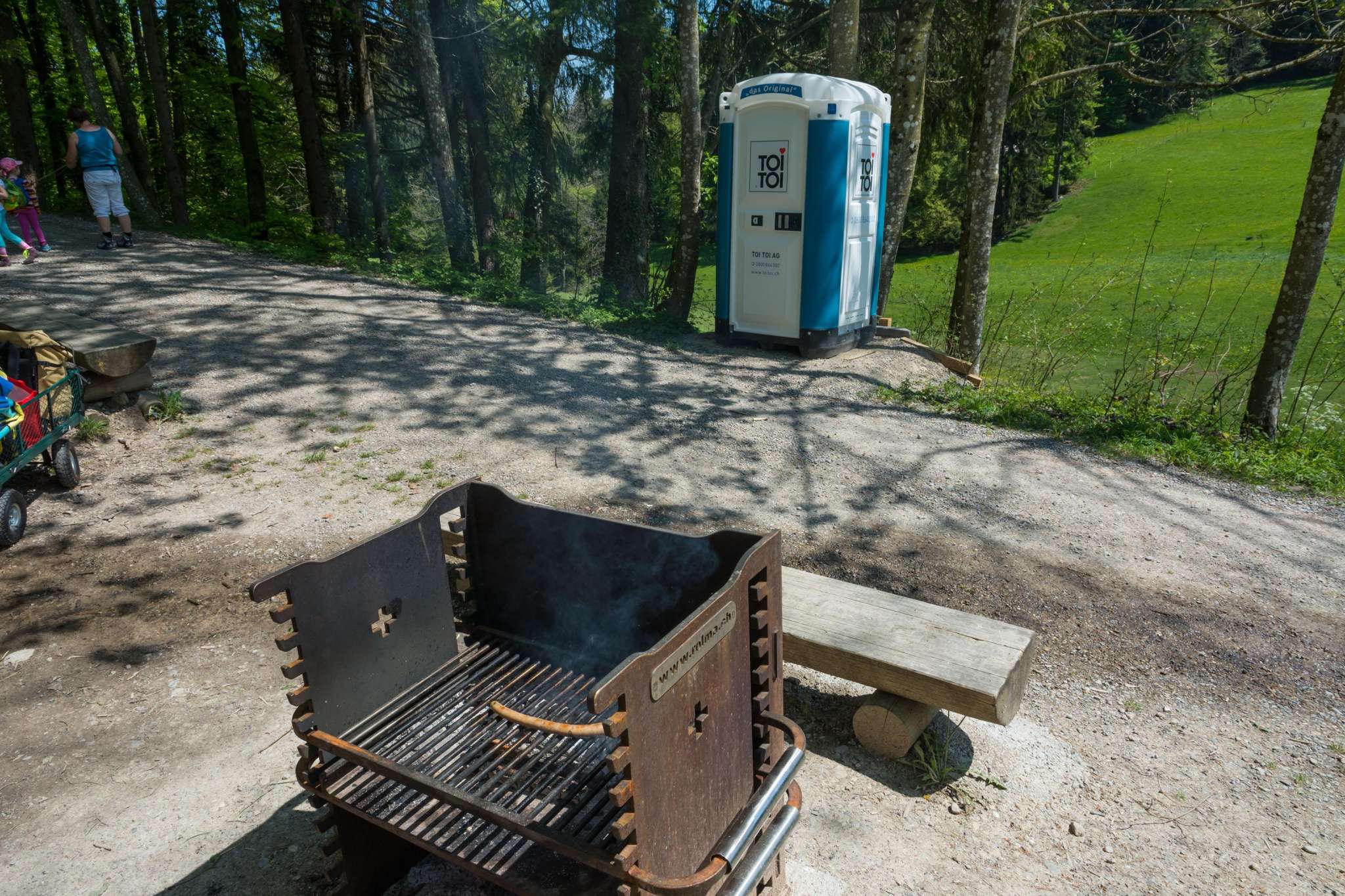 Der Grillplatz Windrädliweg liegt direkt am Waldrand. Er ist sehr gut eingerichtet und verfügt sogar über einen Unterstand, in dem sich ein grosser Tisch mit zwei Bänken befinden. Die Feuerstelle aus Metall verfügt über einen Rost, der leicht in der Höhe verstellt werden kann. Gleich daneben plätschert ein Brunnen. Auf der anderen Seite des Fahrweges steht ein WC-Häuschen zur Verfügung. Selbst ein Mülleimer ist vorhanden. An der Wand des Unterstands befindet sich ein Holzvorrat. Mehrere Bänke verteilen sich auf dem Grillplatz. Kinderwagentauglich: ja, Holz: ja, Trinkwasser: ja, WC: ja, auf der gleichen Wegseite ein Stück weiter im Wald, Kapazität: ca. 25