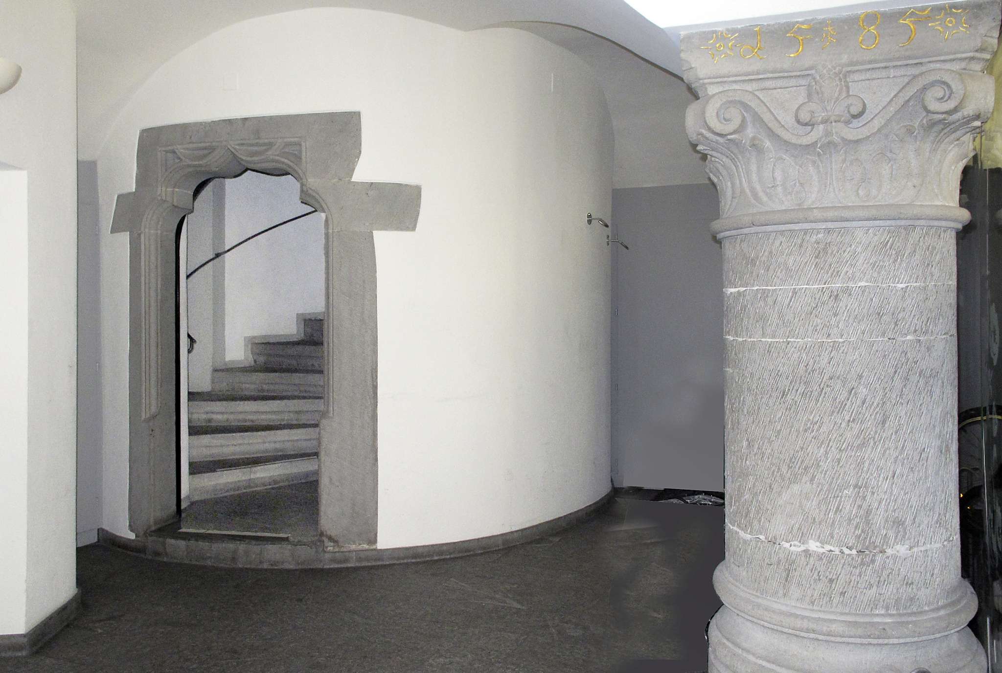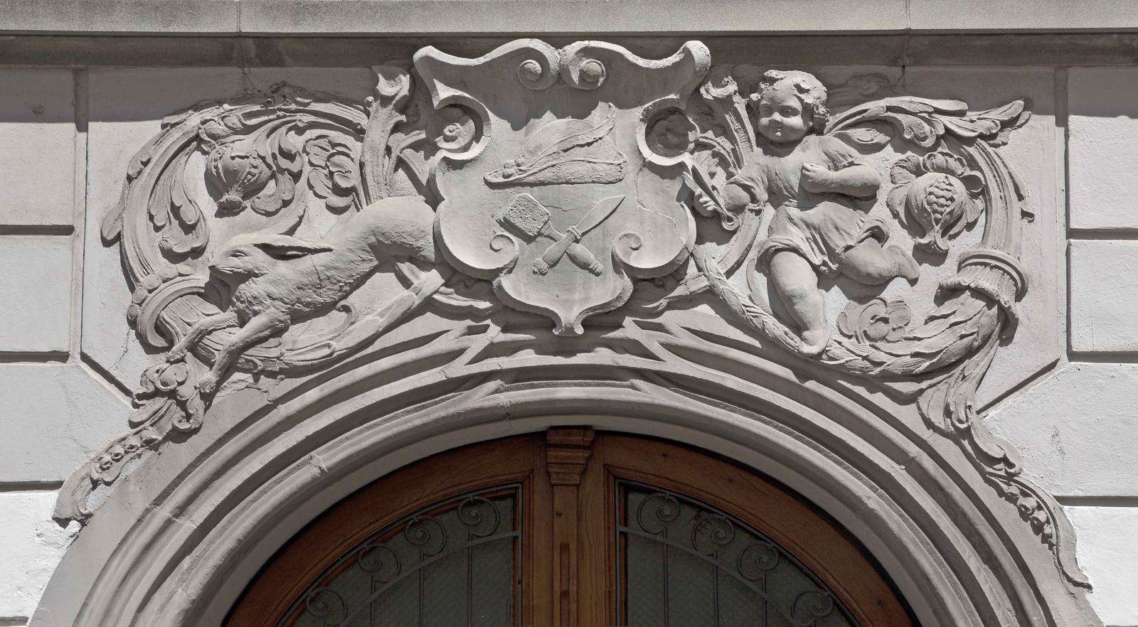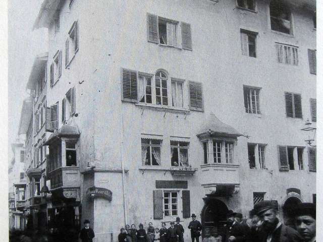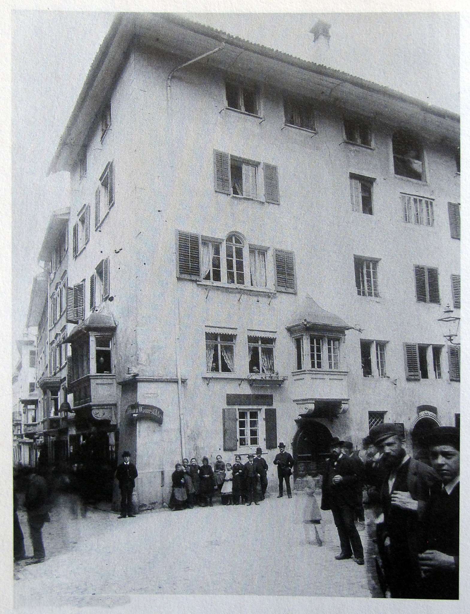 1887 wurde die Westfassade zurückversetzt, um die Marktgasse zu verbreitern – ein markanter Eingriff! Dabei erhielt die Fassade eine neue Gestaltung: Der ursprüngliche einstöckige Erker im ersten Geschoss wurde durch einen zweistöckigen Kastenerker mit Balkon vom zweiten bis vierten Stock ersetzt. Auch wurden Schaufenster ausgebrochen und das Erdgeschoss völlig neu gestaltet, in Sandsteinoptik und mit plastischen Dekorationen über der Haustüre zur Turmgasse.