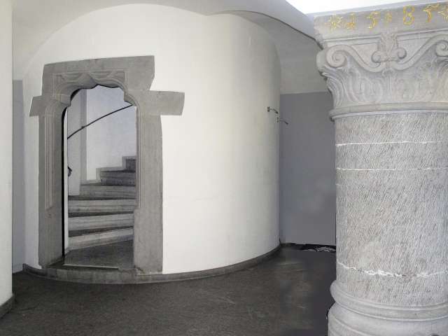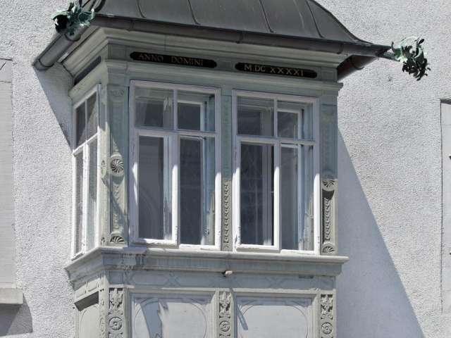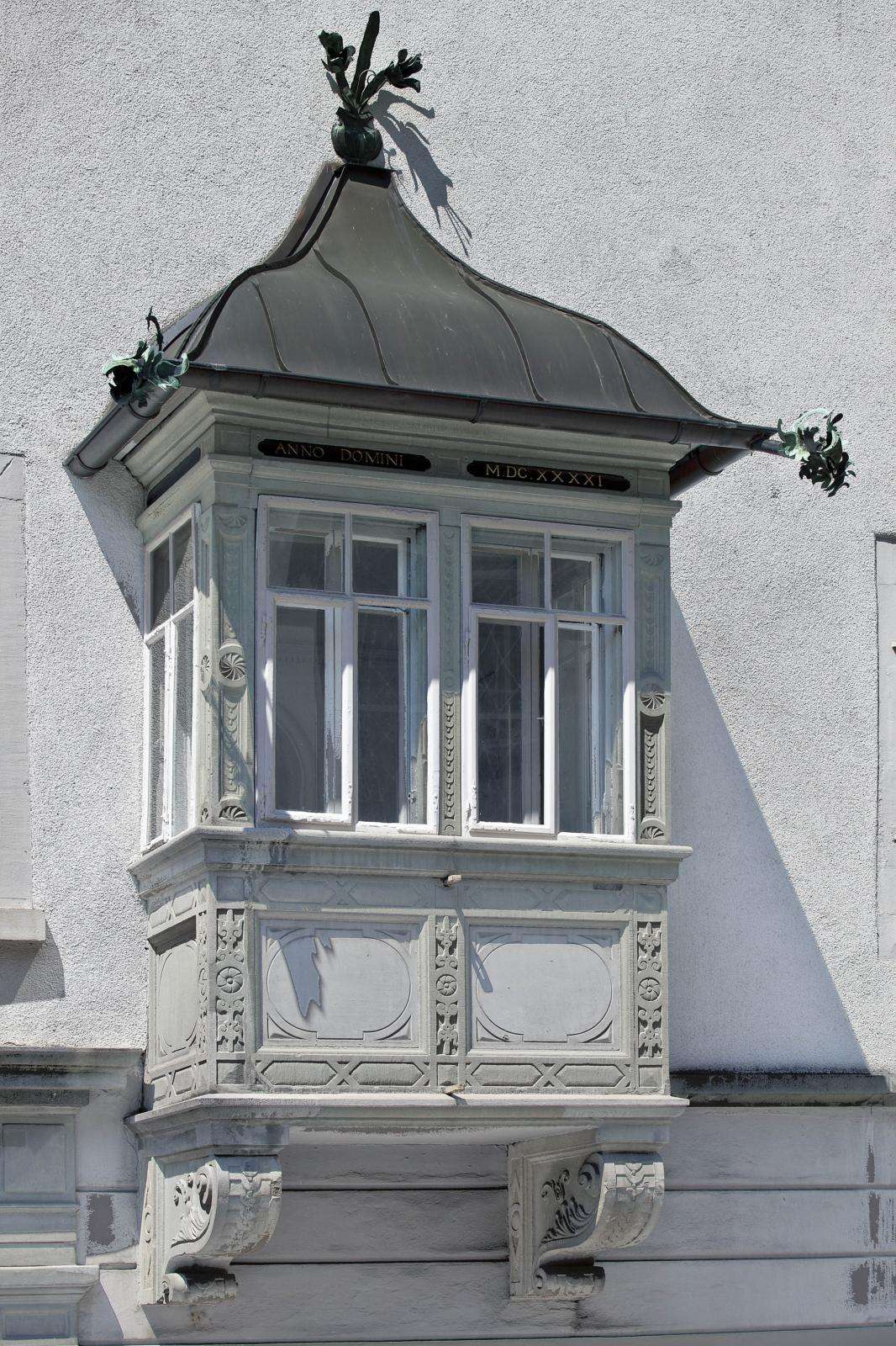 Der Erker zur Turmgasse hin trägt die Jahreszahl 1641 und ist im Originalzustand erhalten. Er wurde also noch in der Ära der Familie Zollikofer-Schlumpf angebracht. Dieser Erker hatte eine wichtige öffentliche Funktion: Von hier aus wurde seit 1667 alljährlich die sogenannte «Werckhmarcktsordnung» verlesen, die den Handel mit Flachs und «Werg», den Rohstoffen der Leinenindustrie, regelte. So wurden an diesem zentralen Ort vor der Stadtkirche St.Laurenzen Preisrichtlinien verkündet oder spekulative Aufkäufe und Zwischenhandel verboten.
