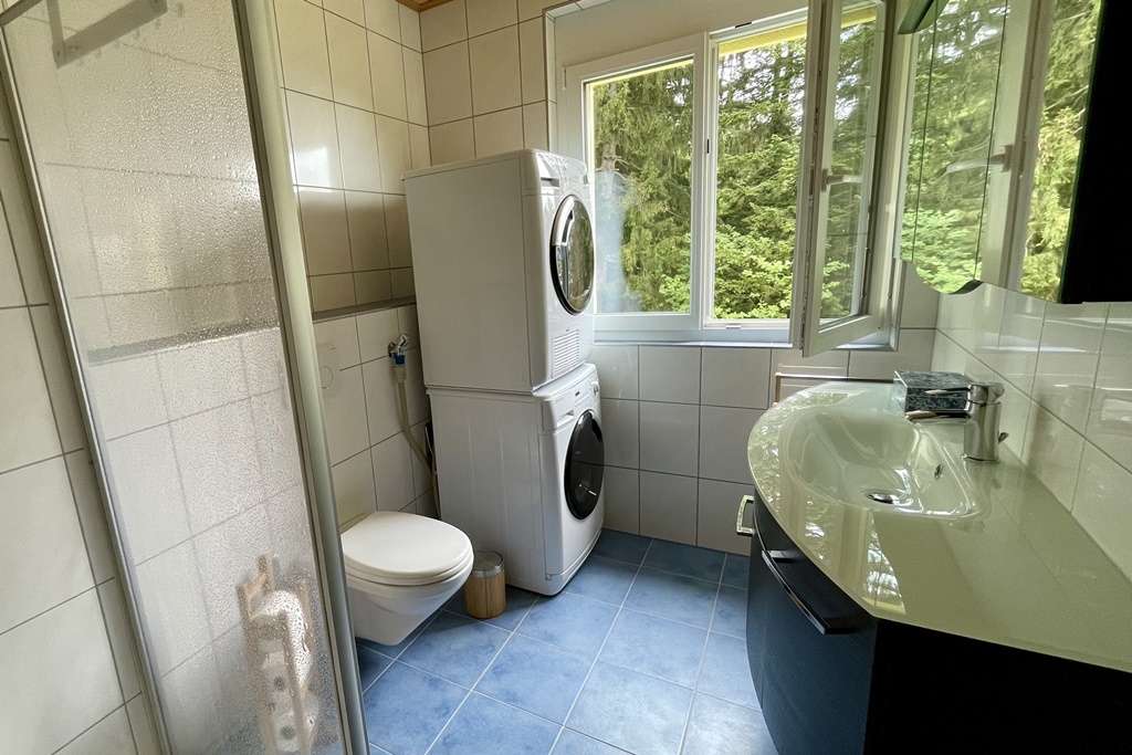 Die Wohnung ist sehr modern und komfortabel eingerichtet. Wohn- und Schlafräume verfügen über einen schönen Holzboden. Bilder und Schmuck verzieren Wände und Regale. Zum Haus gehört zudem eine grosse Terrasse, ca. 25m2 mit Kamin-Grill.