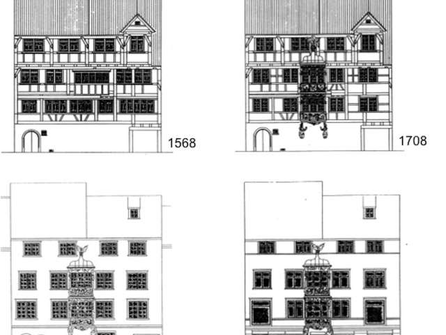 Den Erker liess David Huber im Jahr 1707 bauen. Der Holzbildhauer Johannes Friedrich (1663-1731) schuf in seinem Auftrag ein Duplikat des Erkers am «Hoffmann’schen Haus» in Rorschach. Interessantes Detail: Der in Holz gearbeitete Erker wurde von Anfang an graublau bemalt, mit einer damals sündhaft teuren Farbe, deren Blauanteil aus Smalte bestand, dem ältesten bekannten Kobaltpigment. Bei einer Restaurierung 1905 wurde diese Farbe abgetragen und das nun rohe Holz lackiert. Erst 1992/93 wurde der ursprüngliche Zustand wiederhergestellt – sowie die Deckenmalereien in fünf Räumen freigelegt.