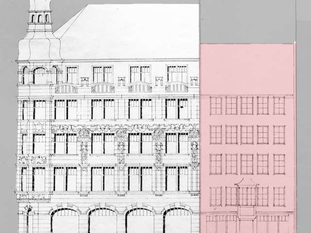 Mit seinen fünf hohen Geschossen – das oberste hinter einer Steinbalustrade versteckt – eröffnet Wendelin Heene eine neue architektonische Perspektive für die Multergasse, die nach 1900 einen Aufschwung als Ladengasse erlebt.