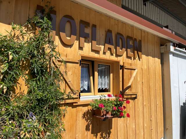 Im Selbstbedienungs-Hofladen finden Kunden 5 Tage die Woche ein ausgesuchtes, saisonales Angebot vom Hof. Gebäck wie Nuss- und Linzertorten, Frischfleisch (gefroren) und Trockenfleisch, Bienenhonig, Hof-Glace, Alpkäse u.v.m. – Wer Zeit hat, verweilt in der angegliederten Besenbeiz bei einem feinen, in Untervaz gerösteten Kaffee und einem Stück Küchen aus der Hofbäckerei.