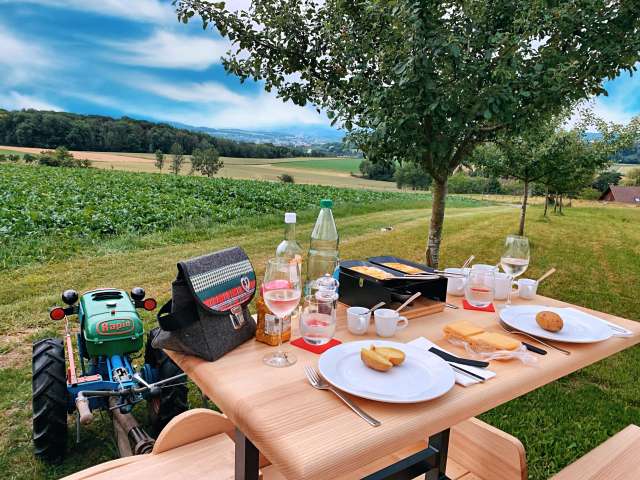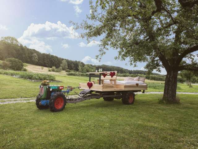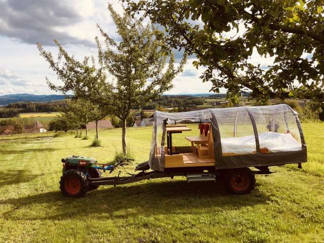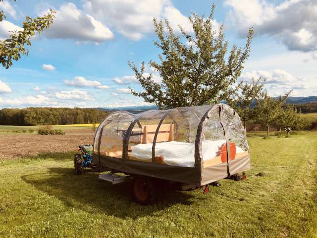 Der Einachser mit aufgebautem Doppelbett kann in lauen Sommernächten unter dem Lieblings-Apfelbaum auf dem Hagschnurer Hof in Hüttwilen geparkt werden. An diesem aussergewöhnlichen Freiluft-Standort, mit nichts als dem Apfelbaum und Sternenhimmel über sich, erlebt man die Düfte und Farben der Thurgauer Natur ungefiltert und hautnah. Auch ein leichter Regen oder unsicheres Wetter verdirbt einem dieses besondere Erlebnis nicht. Neu besteht die Möglichkeit ganz einfach eine durchsichtige Plane über das Himmelbett zu spannen. Ebenfalls gibt es in der Schüür eine Notunterkunft für die Gäste.
