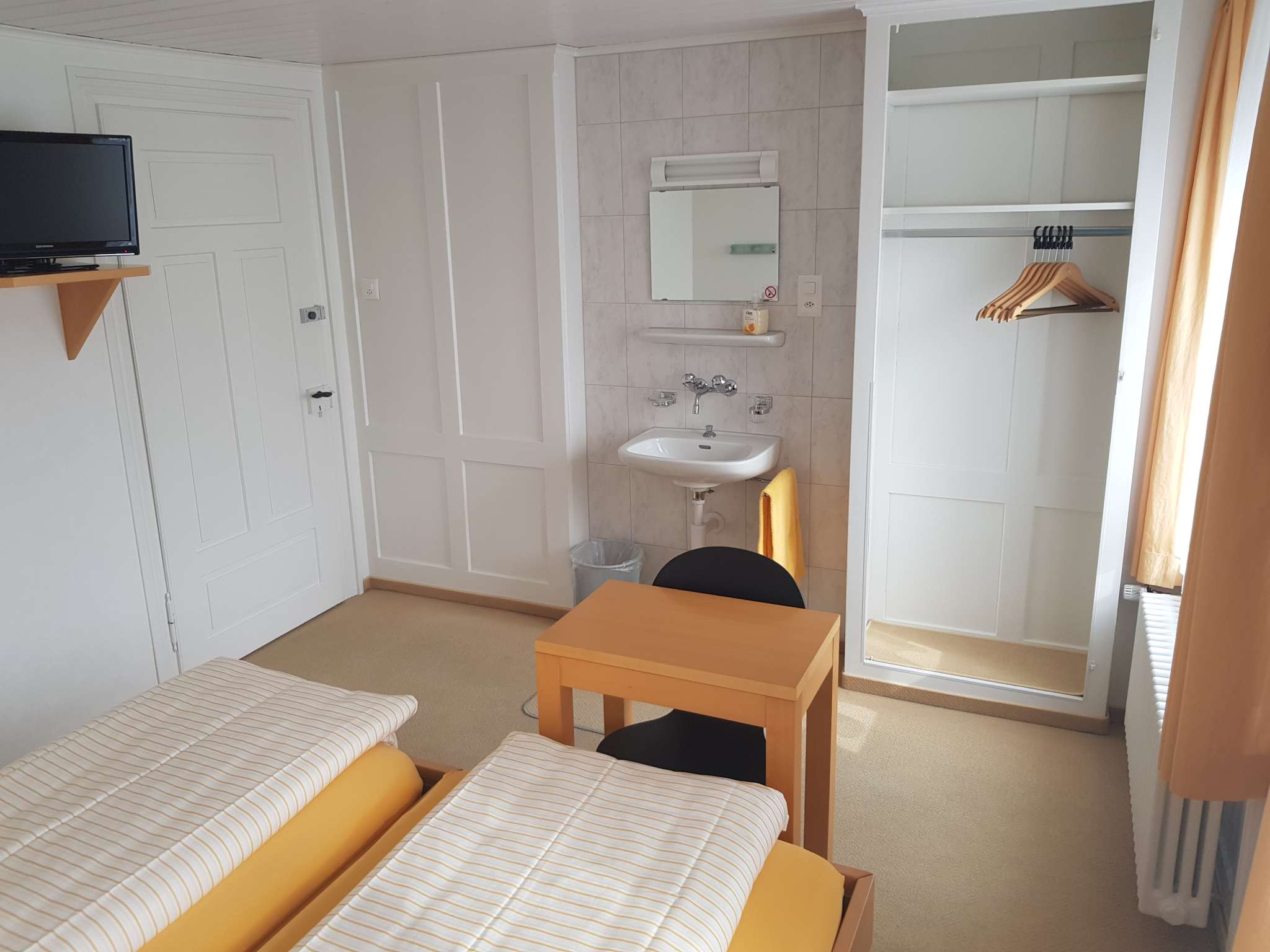 In den Zimmern hat es ein Waschbecken, die Dusche und Toilette befinden sich auf der Etage.