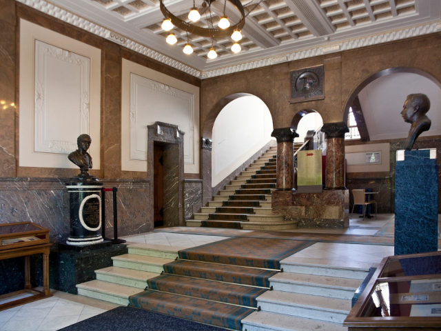 Im Inneren des Gebäudes – in der Eingangshalle und in den Gängen – fallen die vielen schweren und edlen Materialien (Kalk-, Sand- und Schiefersteine und allerlei Marmorsorten) auf. Ein Sechstel der Baukosten soll auf Steinhauerarbeiten entfallen sein! Farbige Marmortäfelung, Jugendstil-Stukkaturen, Kassettendecke, Kunstverglasung und -schmiedearbeiten: Das Gebäude ist innen und aussen weitgehend im Originalzustand erhalten. Nach Expertenmeinung: der schönste Schweizer Bibliotheks- und Archivbau der Jahrhundertwende.