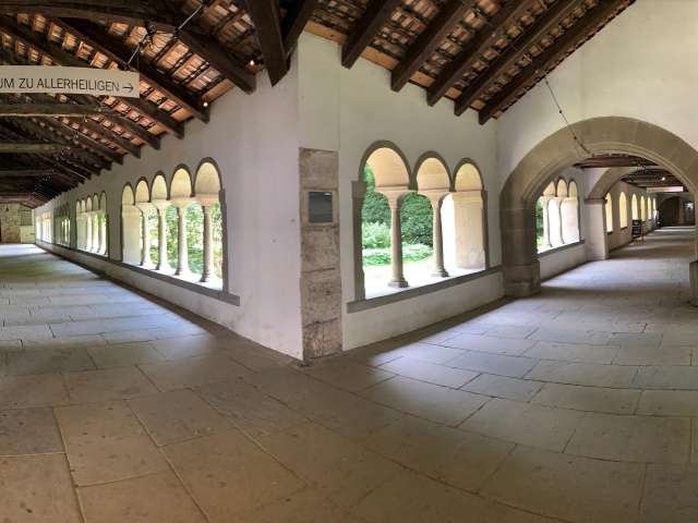 Die einstige Benediktinerabtei Allerheiligen mit der um 1106 geweihten Klosterkirche und dem Münsterturm aus der 2. Hälfte des 12. Jahrhunderts zählt zu den wenigen, gut erhaltenen, romanischen Klosteranlagen der Schweiz. Um 1090 legte man die Grundmauern zu einem grossen, fünfschiffigen Münster. Der Bau blieb aber in den Fundamenten stecken und an seiner Stelle realisierte man das heutige Münster. Der Münsterturm wurde um 1150 errichtet, der Turmhelm ist spätgotisch. 1524 wurde die Benediktinerabtei aufgehoben und das Münster zur Pfarrkirche. Heute ist das Münster Gottesdienstraum der evangelisch-reformierten Kirchgemeinde Schaffhausen-Münster und dient ausserdem als Konzertkirche. Kreuzgang zu Allerheiligen (12./13. Jh.) Der grösste Kreuzgang der Schweiz. Teils romanisch 12. Jh., teils gotisch 13. Jh., umschliesst er den romantischen, bezaubernden Kreuzganggarten, den sogenannten «Junkerfriedhof», in dem von 1582 bis 1874 hohe Schaffhauser Magistraten wie Bürgermeister, Ratsherren, Pfarrer und andere verdiente Bürger und Bürgerinnen beigesetzt wurden.