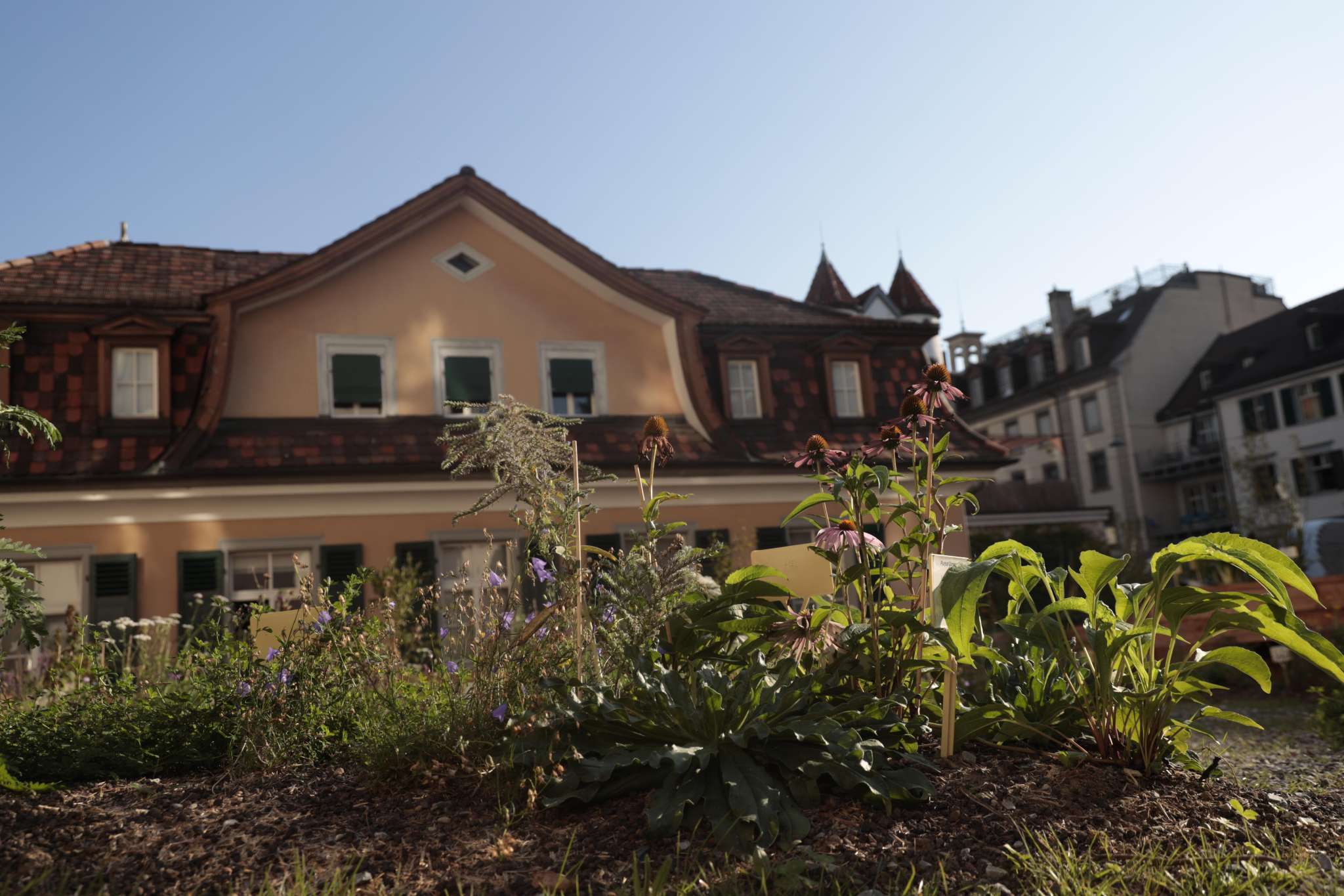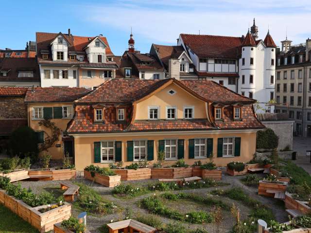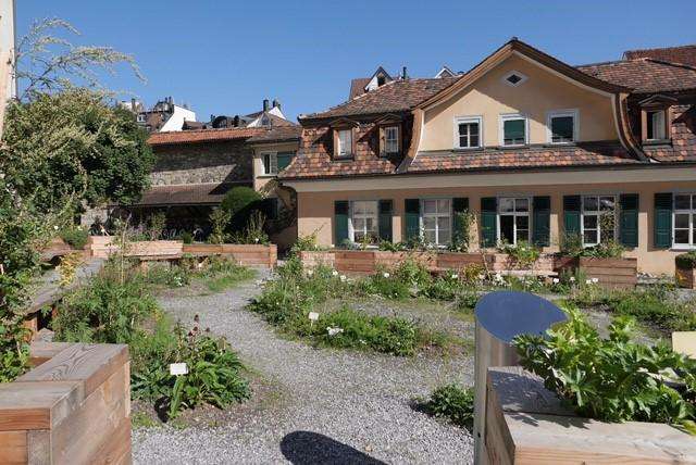 Der Klostergarten zwischen dem Eingang zum Pfalzkeller und dem Regierungsgebäude lädt zum Verweilen ein.