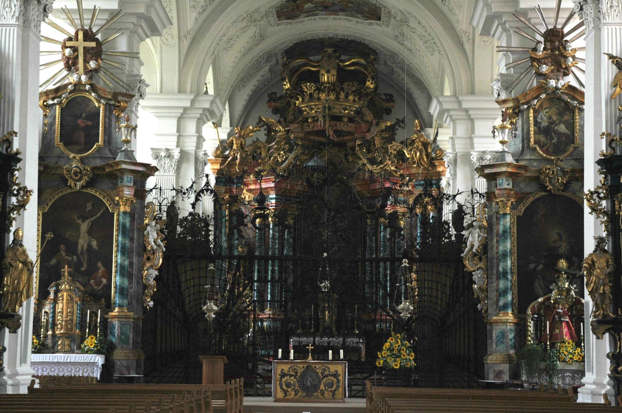 Beim Eintritt in die Kirche beeindrucken die prächtigen Seitenaltäre. Sie sind wie Nebenkulissen auf das Zentrum, dem Hochaltar, ausgerichtet.